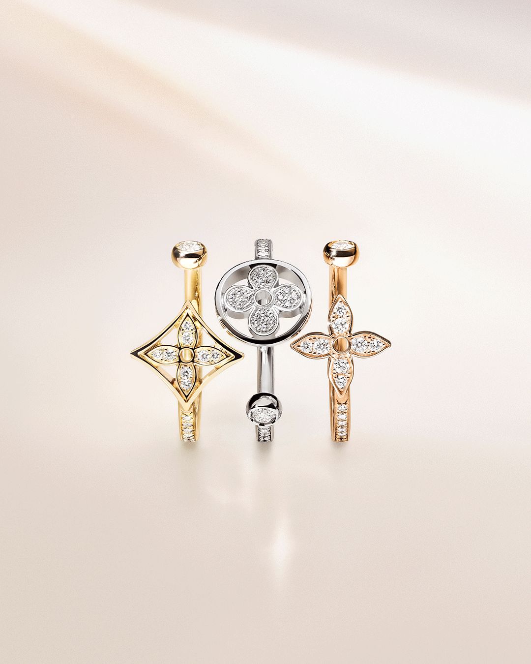 Idylle Blossom珠宝系列诞生于2012年,旨在向始于1896年的路易威登Monogram花朵图案致敬。花朵形态从饱满圆润到轻盈纤巧,完美展现路易威登悠久传承与精湛工艺,如同柔美花卉遇见闪亮繁星。该珠宝系列诞生十周年之际,路易威登为这一系列再添新作,以钻石铺镶诠释现代风格与优雅气质。