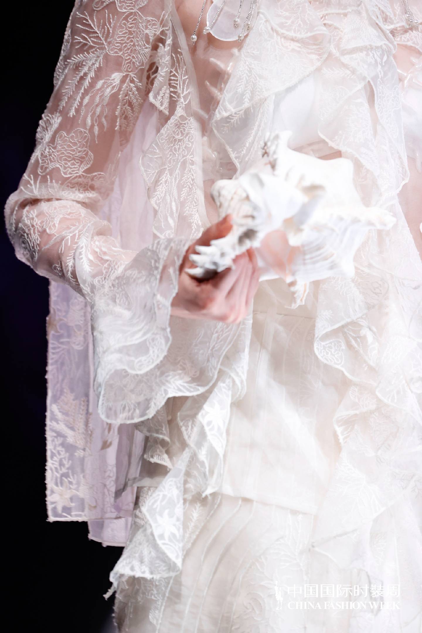 “海之瑰宝”大海是宇宙给予地球的馈赠,汇聚着万千美丽又神秘的生灵。多彩的珊瑚,鲜艳的鱼群,梦幻的水母,丰沛的植物,令人目眩的珠宝,它们是奢华的,丰富多彩的,五颜六色的,我们却以包含一切色彩的白色呈现。从每一块面料的染色开始,从每一根线条的勾勒开始,用看似最平凡的白色,用最不平凡的广绣、法式珠绣,呈现海底不为人知的曼妙与色彩。让海草在胸前跳舞,让珊瑚在双臂间拥抱,让鱼群在周身环绕,让我们穿上它们,融入其中,在大海幻化的秀场里与海之精灵相携共舞。