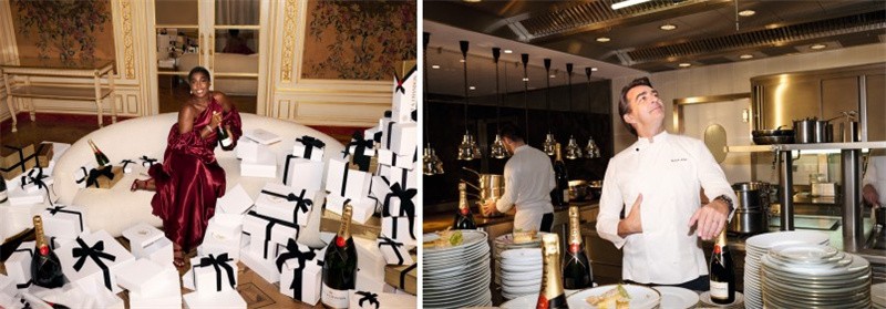 酩悦香槟相信,仪式感对于欢庆场合至关重要。作为晚宴主人的费德勒需要确保每个环节都万无一失。米其林星级厨师Yannick Alléno正在精心准备着晚宴的菜肴;酩悦香槟总酿酒师Benoît Gouez则在为晚宴挑选合适的美酒;时尚偶像可可·罗恰在现场穿梭,堆砌香槟塔,完善餐桌摆放细节;英国演员拉什纳正在为来宾们准备晚宴伴手礼。宾客到来,晚宴开场,费德勒与明星好友、现场宾客共同举杯,用酩悦经典香槟,向这场充满新年氛围的香槟之夜发出赞礼。