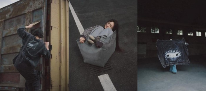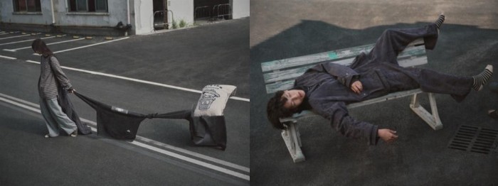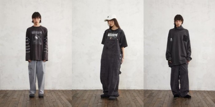 「衰败城市」主题剪贴报薄卫衣,以剪贴报的形式和手写字体呈现Hirono小野形象和字体,配合洗水做旧效果,颇有野外的破旧感;诗句满印背带裤则以深灰色配合诗句图案呈现,营造一种荒野中仍然追求精神自由的感觉;而公路高领卫衣则以黑色打造,加入了胸前口袋设定以及领口、袖口的破坏处理,像是放肆经过了一场酣畅的公路之旅。