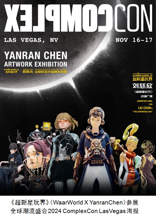 全球潮流盛会ComplexCon于2024年11月16日和17日在美国内华达州拉斯维加斯举办,雨果奖得主、《三体》作者刘慈欣第一部长篇科幻小说《超新星纪元》动漫厂牌——《超新星玩界》(WaarWorld)全新IP“玩者系列”第一弹收藏级潮玩重磅亮相于由微像文化(Storycom)携手新锐艺术家陈嫣冉Yanran Chen及其工作室ACCRO STUDIO(无尽工作室)联袂打造的艺术空间,讲述人类文明巨变后超未来世界的故事。中国最有影响力的科幻作家刘慈欣,中国科幻文学的翘楚之作《超新星纪元》,中国优秀的年轻艺术家陈嫣冉,三者跨领域、跨时代的碰撞,为世界艺术爱好者带来了一场视觉盛宴。