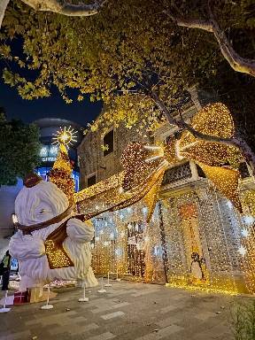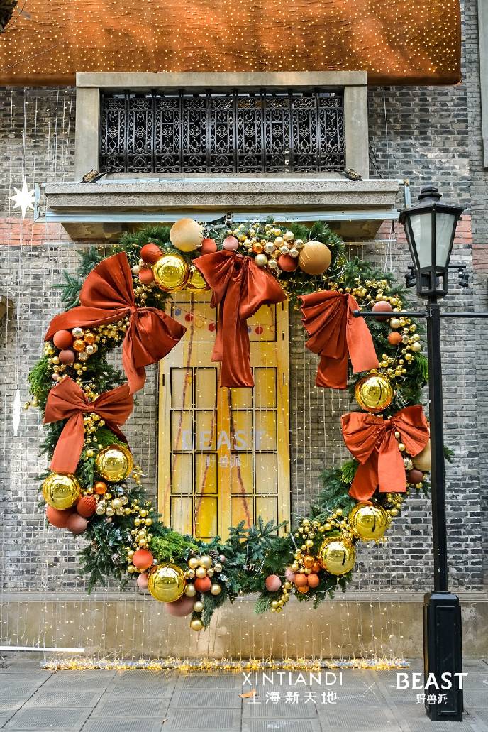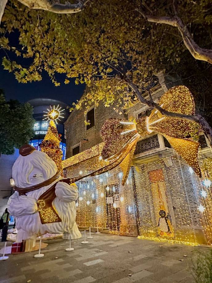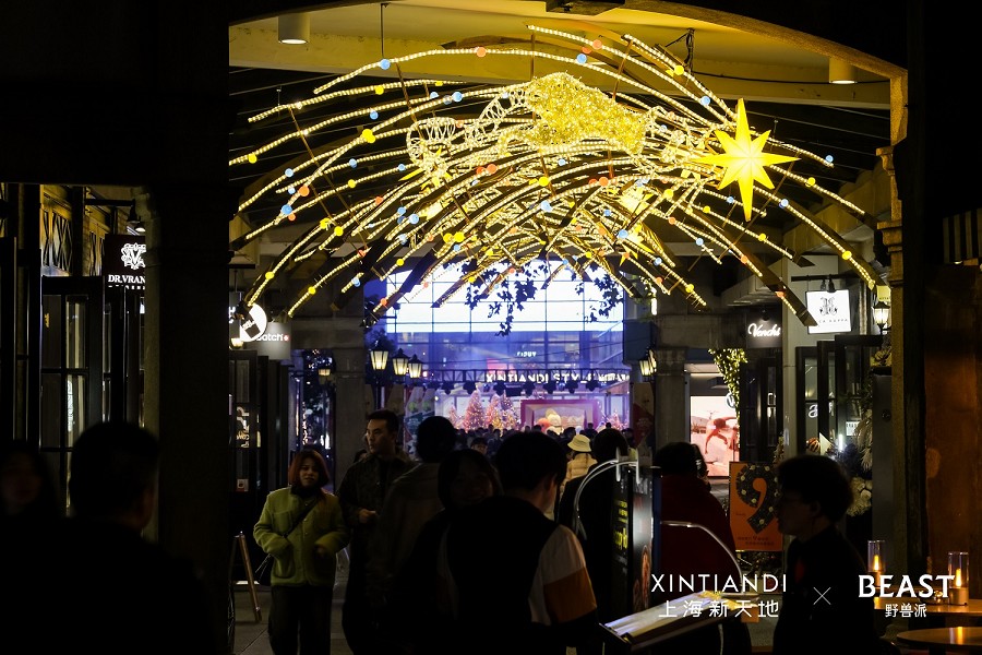沿着化身“摘星长廊”的石库门街区通道前行,你会遇见忙碌的野兽小分队,他们正合力将璀璨的金色圣诞树运往新天地时尚I。