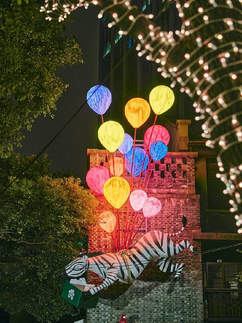 循着雪怪的足迹一路探索,石库门建筑仿佛被施加了魔法,雪国的动物居民们从童话里现身,出没于新天地的各个角落:野兽宅急便的斑马从POLUX墙面掠过,马来貘则从CALIX外墙边匆匆骑行而过演绎月圆小夜曲,它们共同守护着这片雪国的安宁与美好。