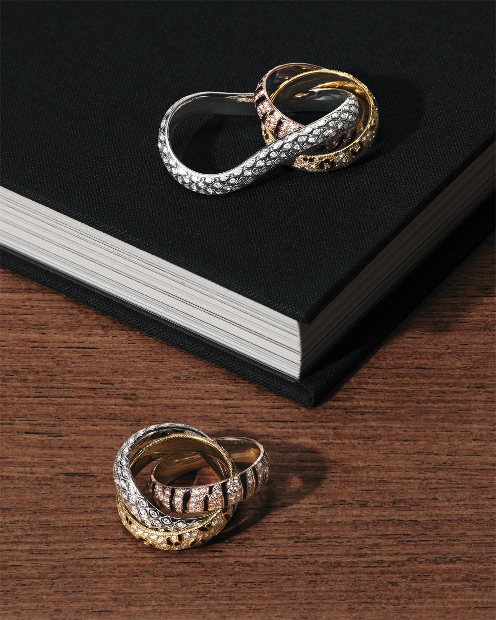 每枚环圈皆饰以动物图纹,引发无限遐想:白金环圈上的蛇鳞起伏延绵,黄金和玫瑰金环圈以黑漆勾勒的豹斑和虎纹,分别呈现圆润饱满或立体分明的造型。