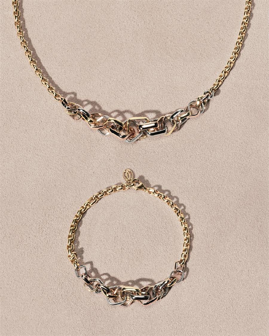 卡地亚构思出两款全新项链和一款手镯,层次丰富的枕形环圈巧妙重叠,化作璀璨华美的珍贵链节,将Trinity系列的几何美学尽数展现。