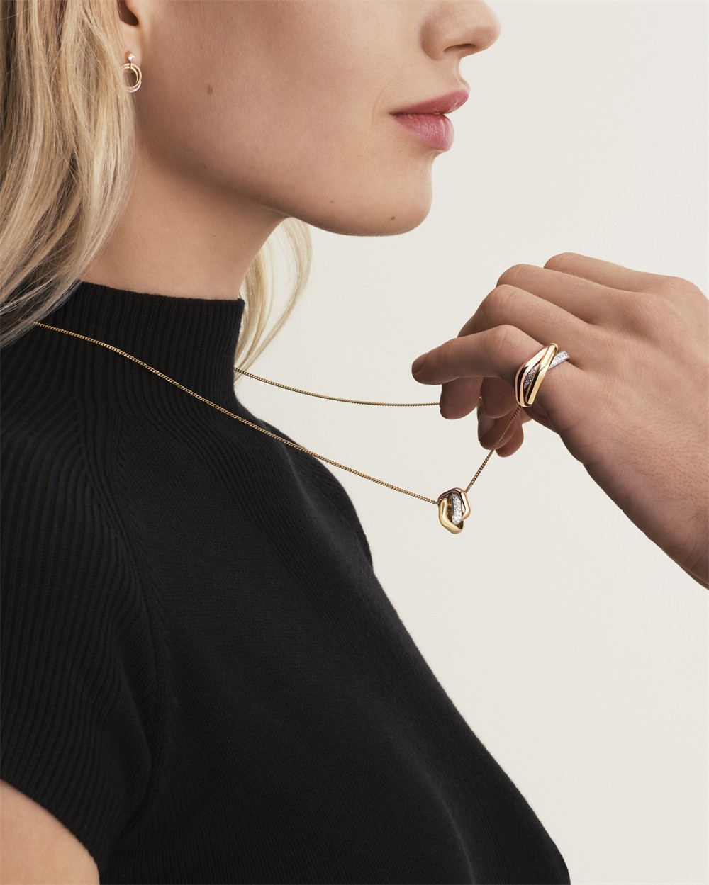 对品牌创意工作室而言,枕形款式的挑战在于──如何令其环圈如圆环款式一般自然交叠并活动自如。