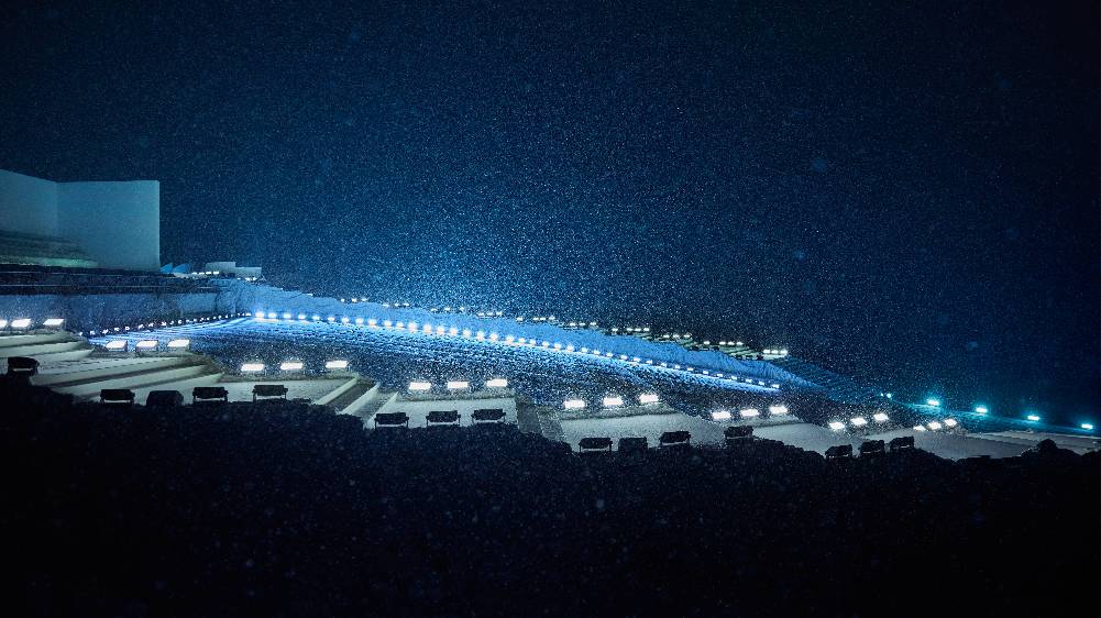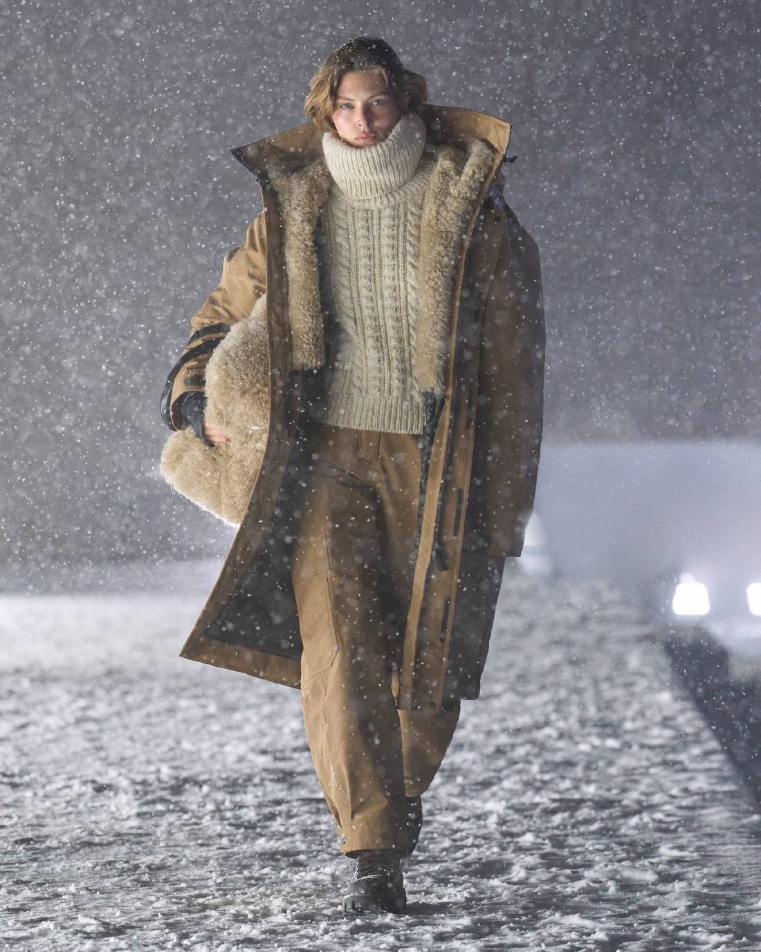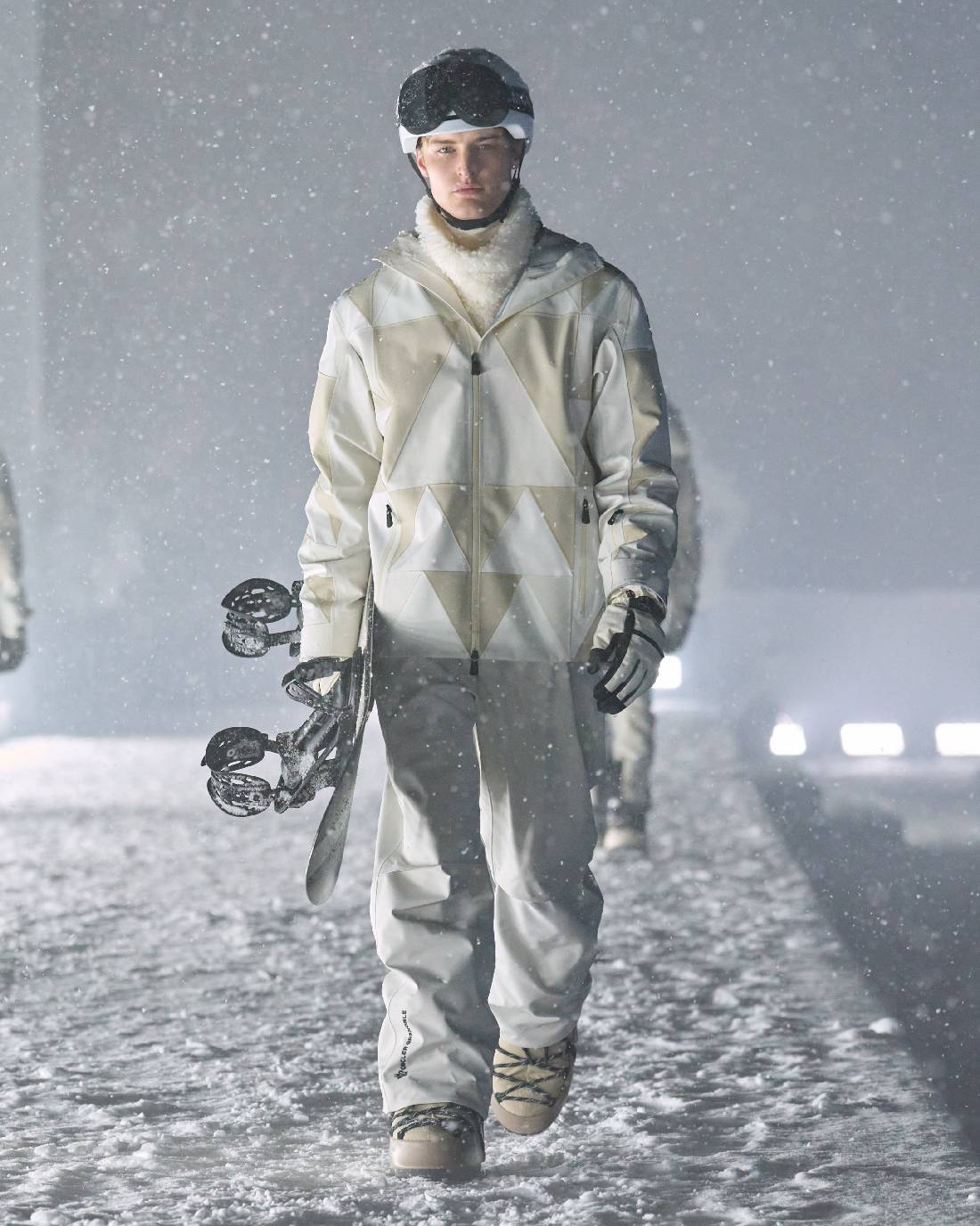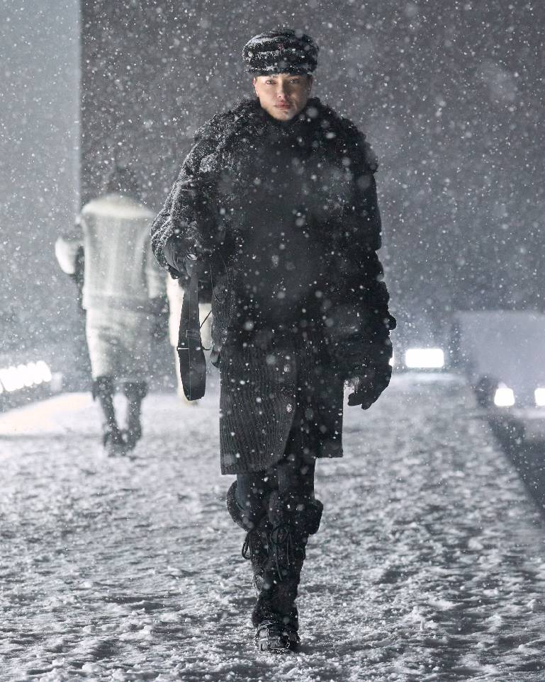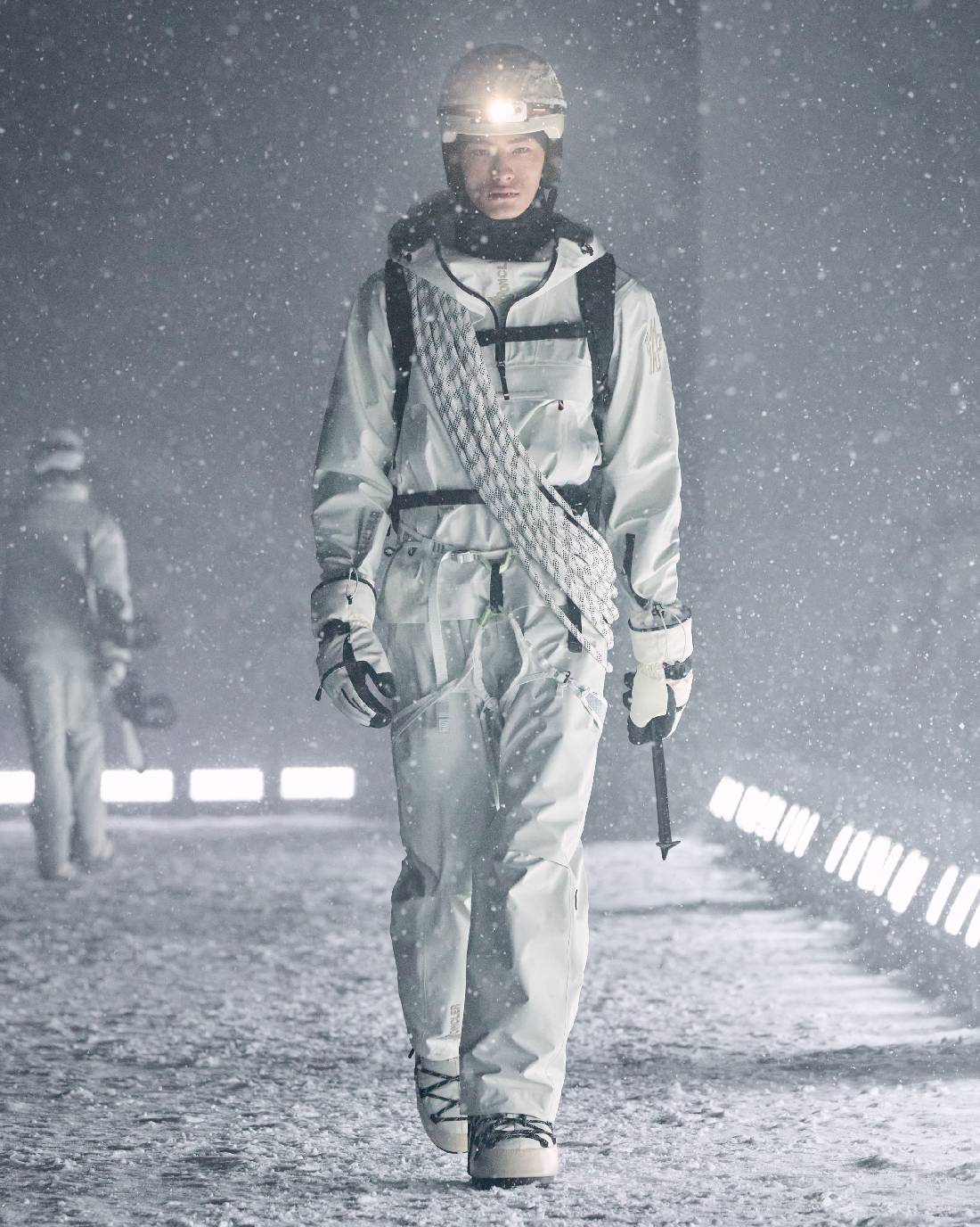 Moncler Grenoble以屹立峰巅之姿,令高性能与高格调熔铸共生。在盟可睐Moncler多维度探索中,Moncler Grenoble是品牌山地基因至为纯粹的传承者,更是孜孜不倦的功能美学探索先锋。Moncler Grenoble秉承性能奢华之理念,以重峦叠嶂为天然秀场,完整覆盖山地生活全场景:从雪坡疾驰到雪后休闲时光,尽释雪域美学真谛。 昨夜盛典不止是一场时装发布秀,更是一场始于传奇高雪维尔机场的星光之夜。皑皑白雪覆盖的山峦构成天然画布,宾客全然沉浸于摄人心魄的冬日仙境。当夜幕垂临,白色光柱构筑梦幻穹顶空间,为露天秀场营造私密氛围。宾客身披白色羽绒斗篷环绕U型秀场入座,更将雪峰纯净本色融入秀场每一处细节。现交响乐团演绎盛邀嘉宾同启沉浸式感官飨宴。曼妙的小提琴协奏曲交织当代韵律与古典华章,放大此刻的奇迹共感。