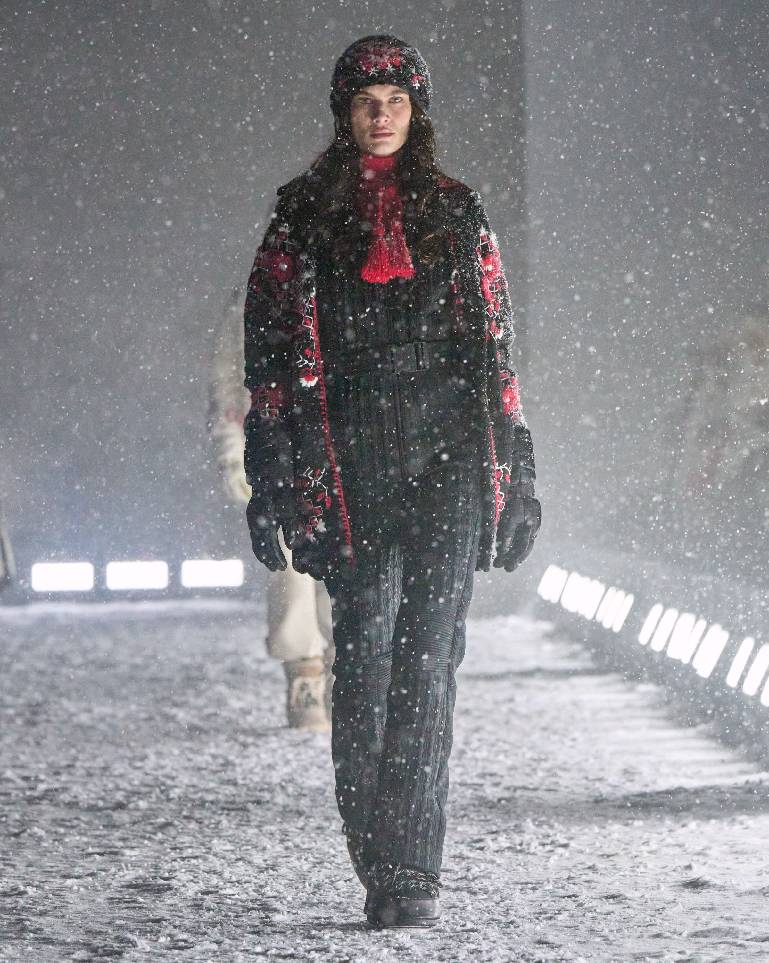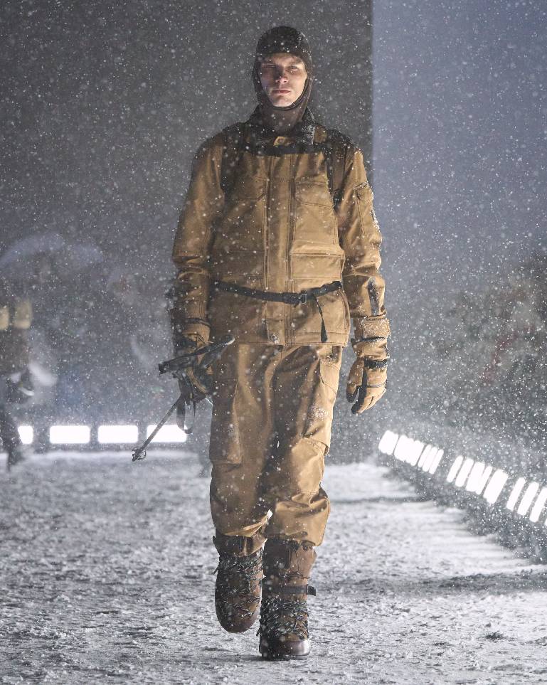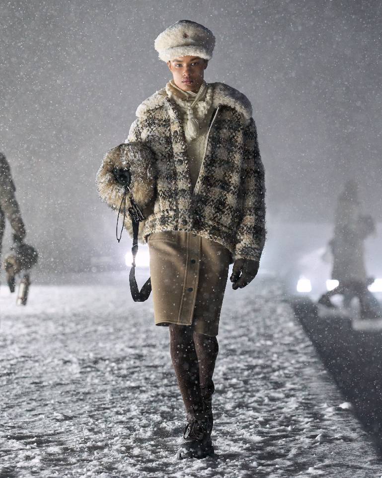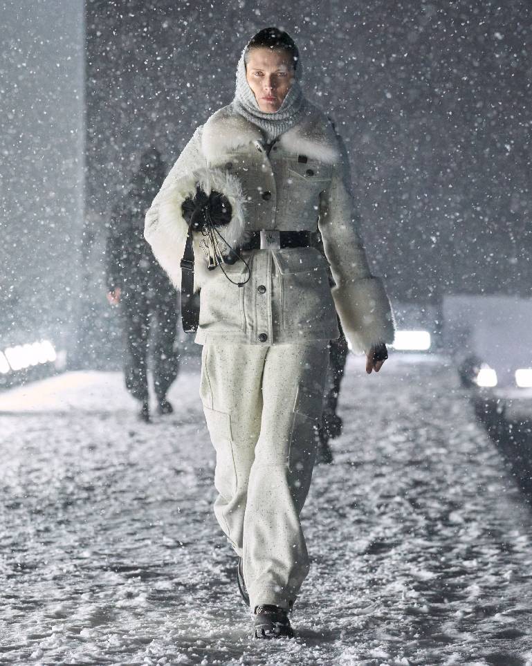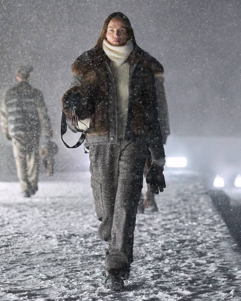 本系列所崇尚的雪道与都市生活时尚格调,亦体现在非常规材质的巧妙诠释之中,包括从工装领域汲取灵感的丹宁与帆布,源自正装的千鸟格纹精纺羊毛,乃至经特殊处理、覆以隐形膜层的高性能肌理仿羊羔绒。滑雪服与外壳单品融入精致嵌花,将源自工坊的卓越技艺注入高科技运动装备。从外搭、厚实内层乃至裙装,针织材质以温暖质感与合身剪裁贯穿全系列。两件套套装仿若长绒粗花呢与粗花呢类质感,实则采用尼龙漆面微拼接基底上的精纺羊毛刺绣工艺。天然与合成羊剪绒材质以长款大衣或点缀领口、袖口及长绒手袋的形式,为系列增添触感层次。