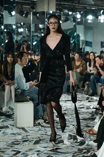 MARKGONG 2025 秋冬系列游走于聚光灯下的璀璨与幕后混沌之间,解构千禧世代的欲望图谱。从狂欢到重塑,从破碎到觉醒,这种矛盾与拉扯正是本季的核心美学——在自我迷失、挣扎的混乱中寻找平衡、在争议中绽放力量。收腰廓形皮草拼接大衣勾勒利落身姿;黑色流苏自肩线与裙摆摇曳而下,经典钉珠花朵悄然绽放;舞池之夜的紧身束胸上衣与皱褶吊带裙贴合曲线,透视蕾丝大胆展现女性魅力,豹纹元素则注入桀骜野性。Paris Hilton 经典的 Slogan T 贯穿系列,以戏谑笔触重新解读女性自我表达的边界。