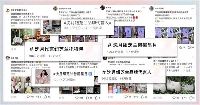 此外,小红书、抖音、得物等多平台时尚达人集体花式种草。1300多位KOL分享沈月同款托特包,引发全网热议与跟风。沈月×纽芝兰全平台话题曝光量超1亿,讨论量超100万,用户纷纷晒出穿搭攻略、分享同款使用感受,掀起“沈月同款包包”热潮。各平台UGC内容持续发酵,明星同款热度持续攀升。