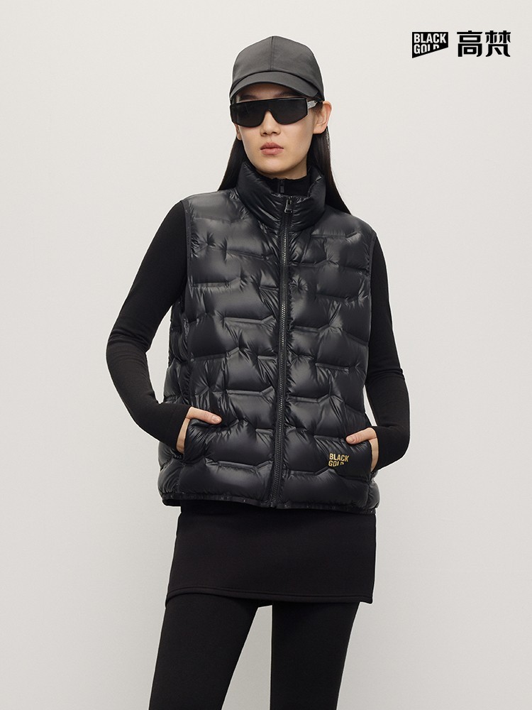 小金砖马甲的核心魅力在于“轻暖无界”,轻盈重量(不足一瓶水)使其成为叠穿的绝佳选择——内搭高领针织衫或衬衫,外披风衣或大衣,既能应对早晚温差,又能保持利落身形。修身剪裁进一步修饰腰线,插肩袖设计自然遮肉,无论是通勤时搭配,还是滑雪时作内搭,这款马甲都能灵活融入生活场景。