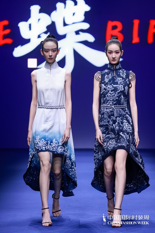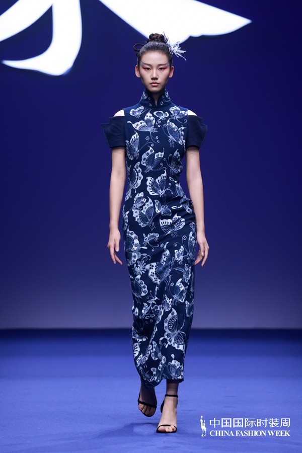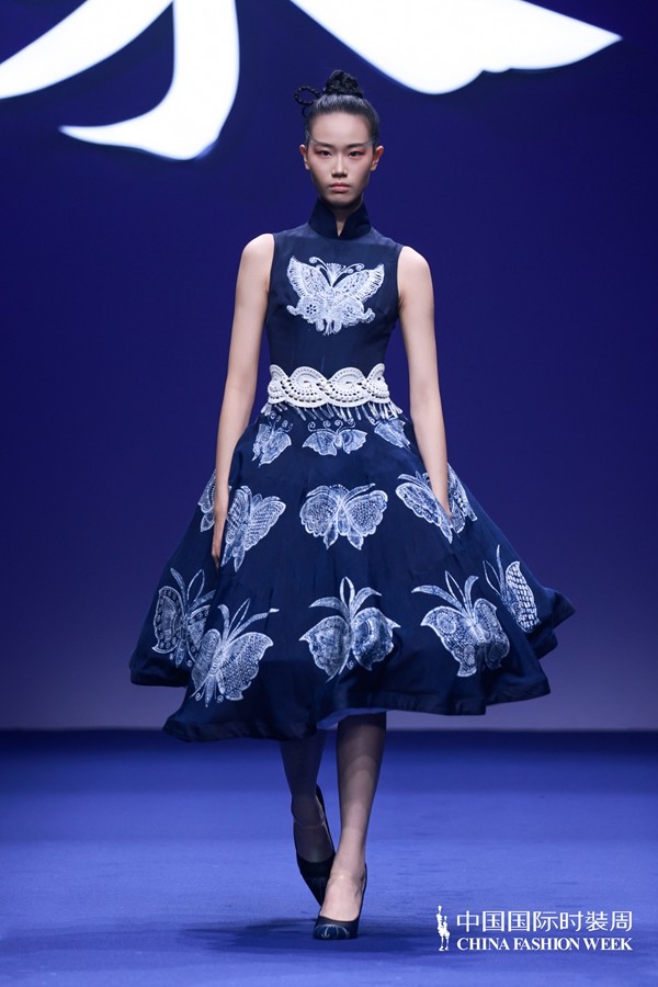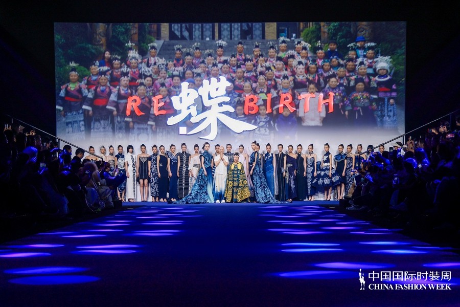 谢幕时,模特鱼贯而出,非遗传承人身着蝴蝶礼服再次回到起点,一同谢幕,传承人合唱的《蓝莲花》旋律响起,大屏幕上出现团队所有蜡染传承人的合照,肩负使命的非遗传承人成昊展示的不止是服装,他的每一次呈现,探讨的都是关乎非遗发展的重大议题,在文化价值与消费趋势之间找寻平衡的努力,为手艺人的生活改善而加强实用性的设计探索,也是作为江服教师为学与研打开的“蝶”变之门。