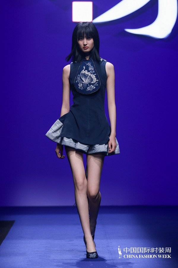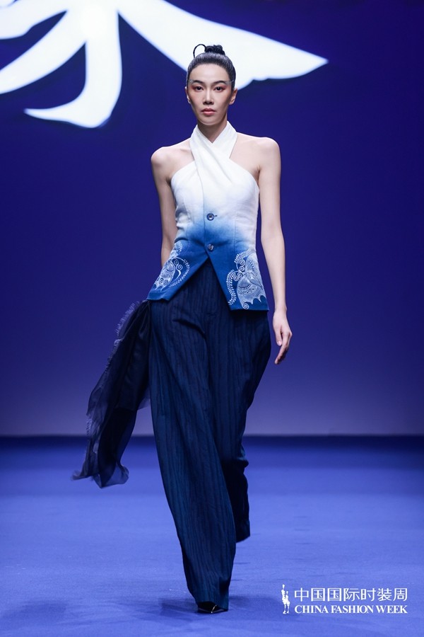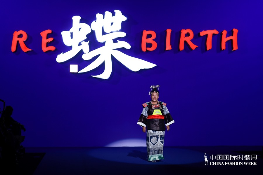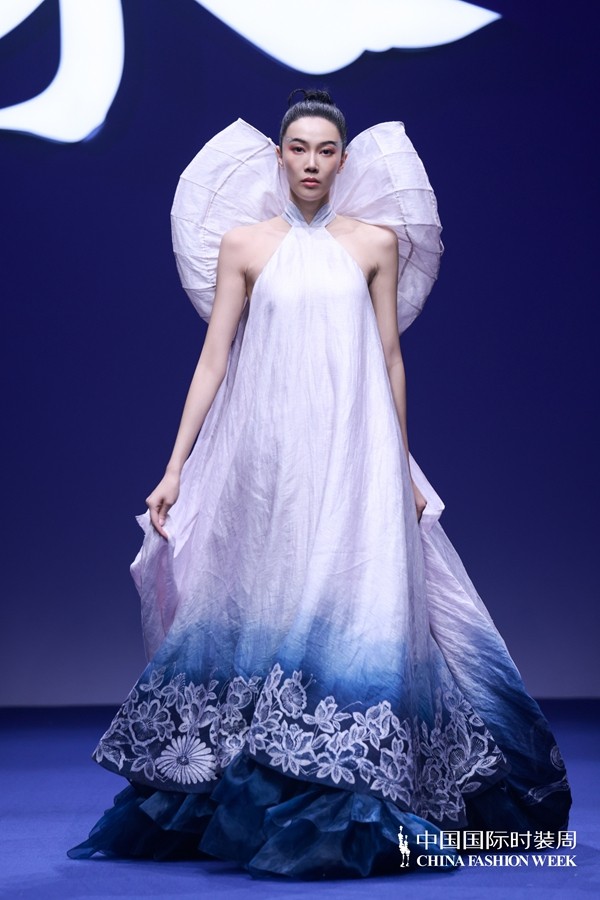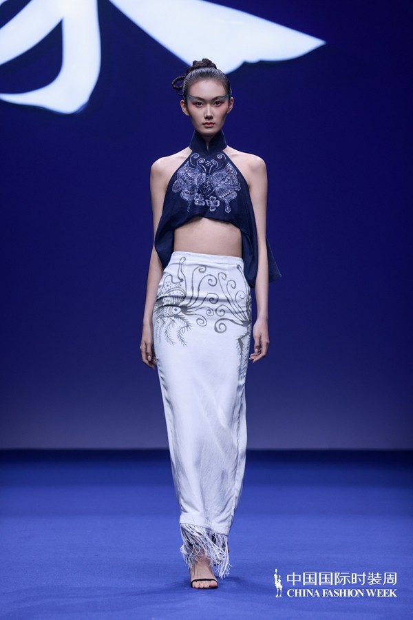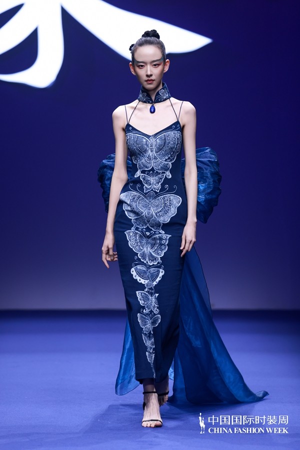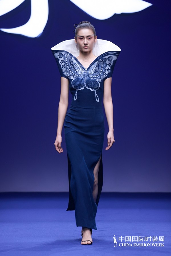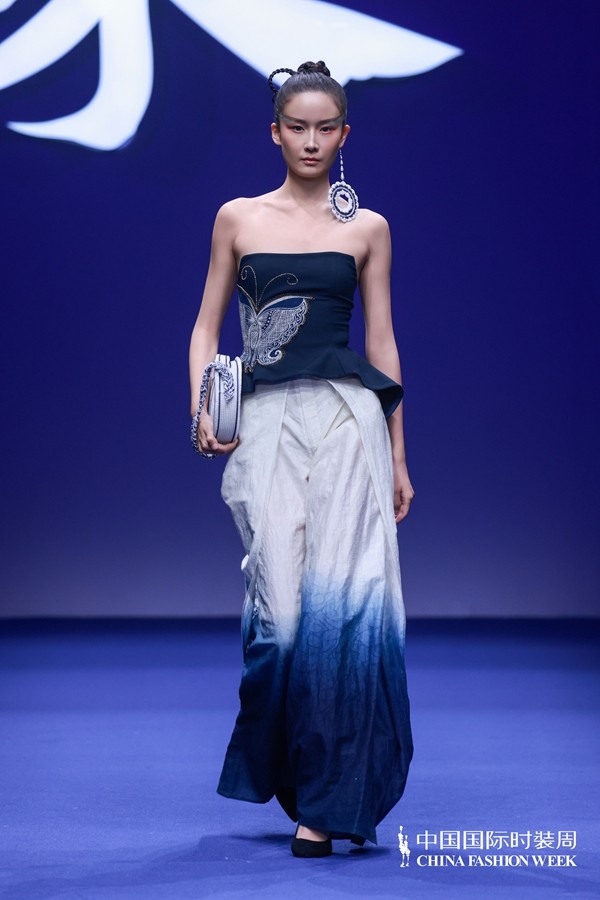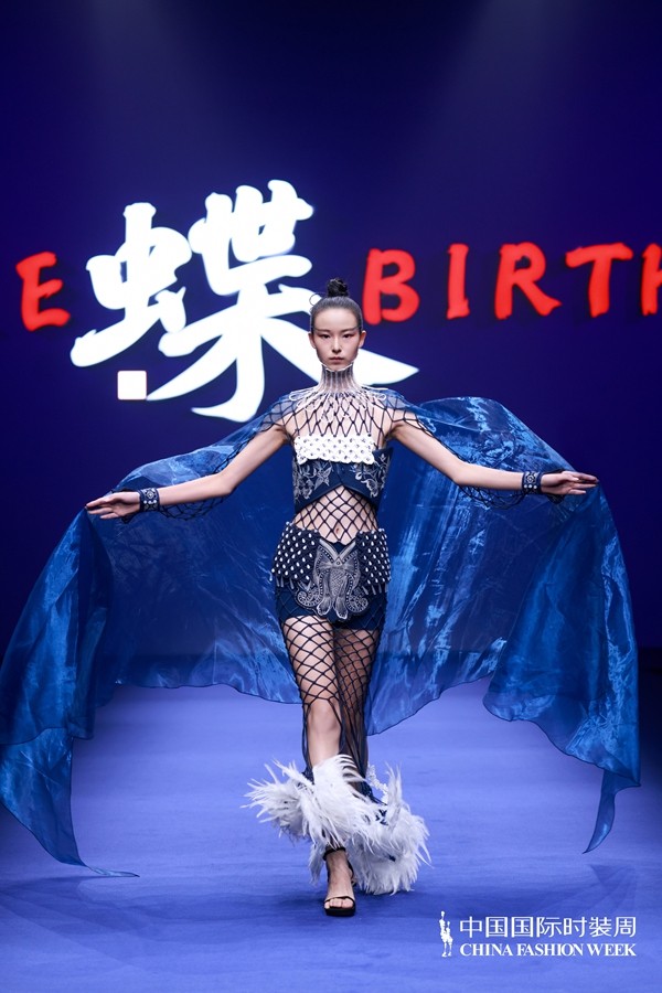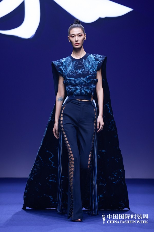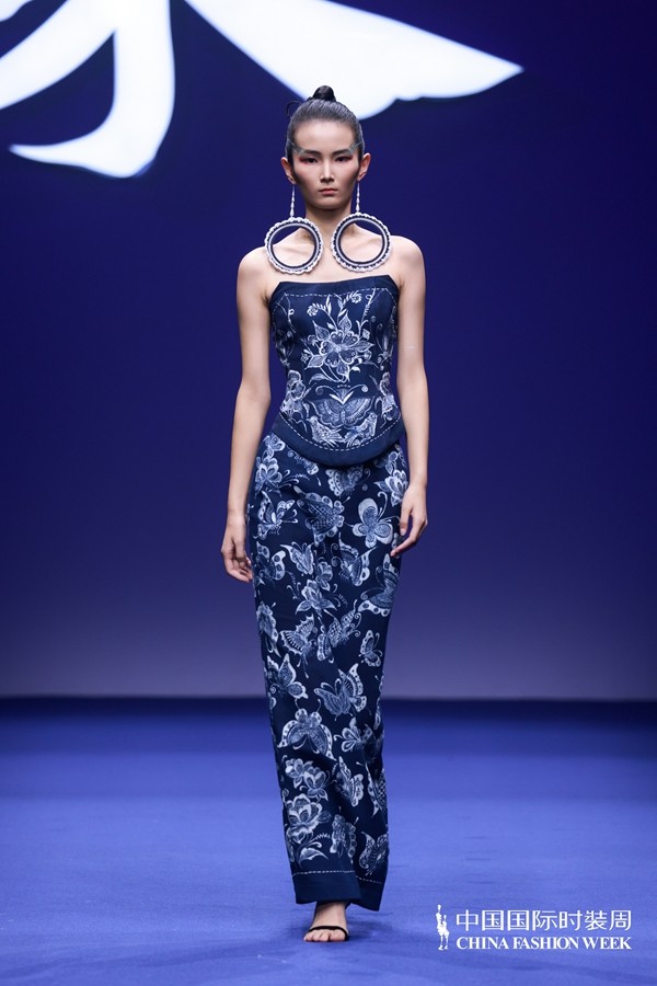 成昊营造的秀场,是一方神秘且蕴含生命力的茧中世界,黑暗中的微光,有吟唱古歌的缥缈,似乎能嗅到蓝靛植物染料的气味,无需刻意打造,设计师讲述的生动故事里有突破通感的流动意蕴。“蝴蝶从枫木心诞生,与水泡游方结合生下十二个蛋,经鹡宇鸟孵化出姜央(苗族始祖)、雷公、龙王等十二神,成为生命起源与万物繁衍的象征。”体现了苗族“万物有灵,生息与共”的民族信仰。光源渐亮,一位身着传统苗族服饰的蜡染传承人缓缓走上舞台,靛蓝色的底布上,细密的蜡纹勾勒出简约的蝴蝶雏形,针脚细腻的苗绣银饰随着步伐轻轻晃动,细碎的声响里,是非遗技艺传承千年的有关生活的韵律和步调。
