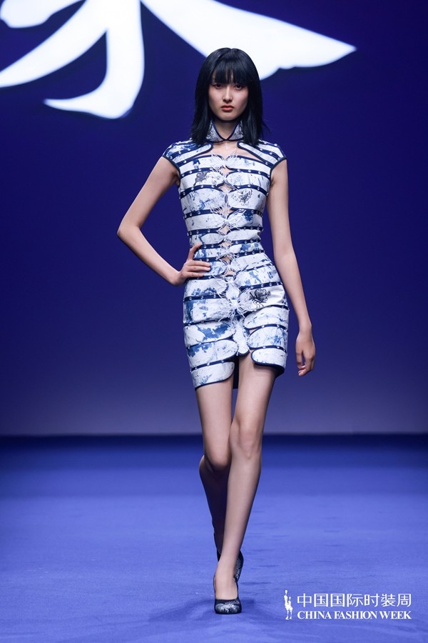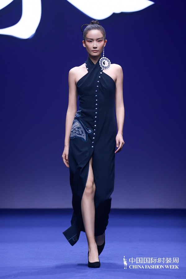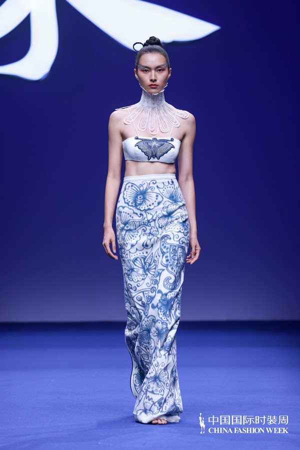 有意味的是,设计师成昊对设计语言的延伸与迭代,不断突破观众固有的工艺认知。本季他提出了“蜡染+”的概念,打破非遗之间不同工艺的壁垒,将蜡染、绳结、编织等融汇在同一设计语境之下,以当代审美和开放的心态将3D打印技术无缝融入非遗创作,使非遗立体化,巧妙解读厚重历史文明与时下消费者的“读取时差”。