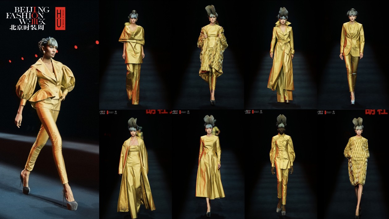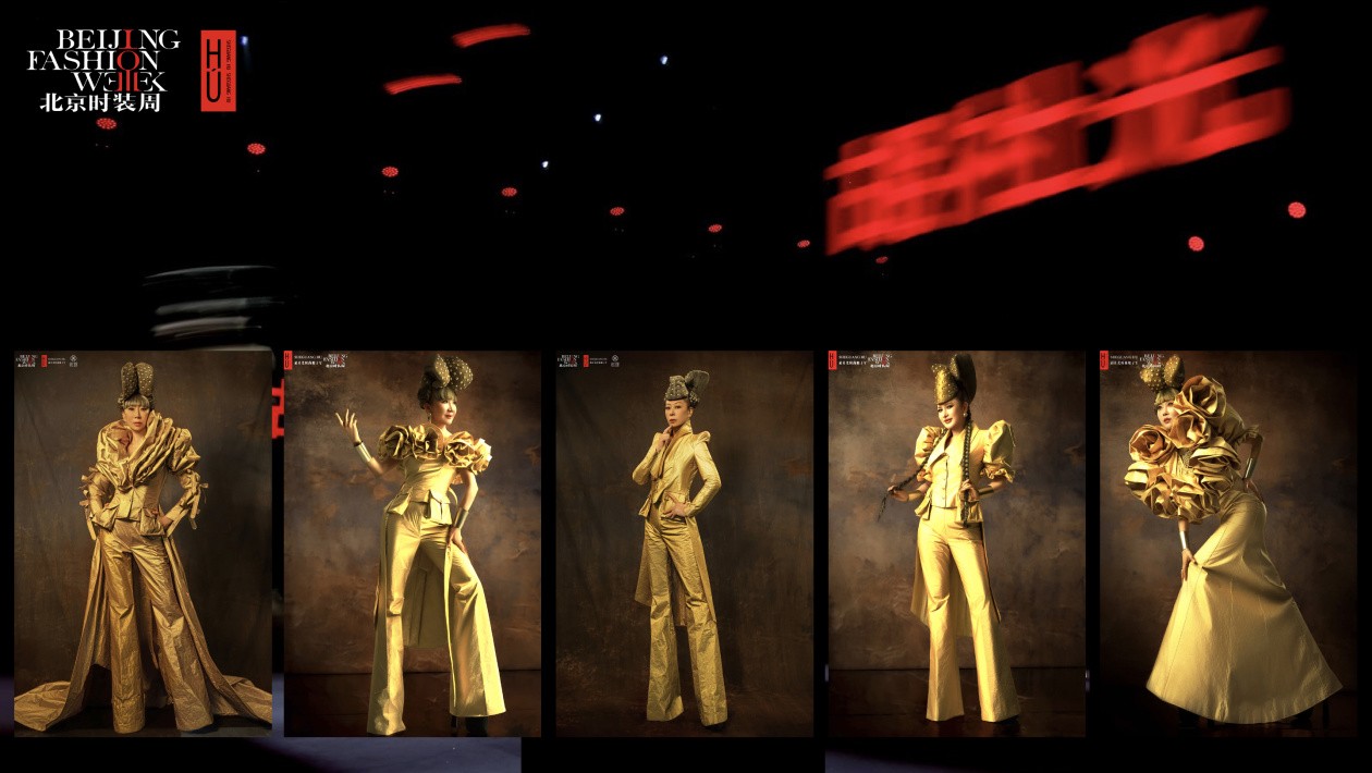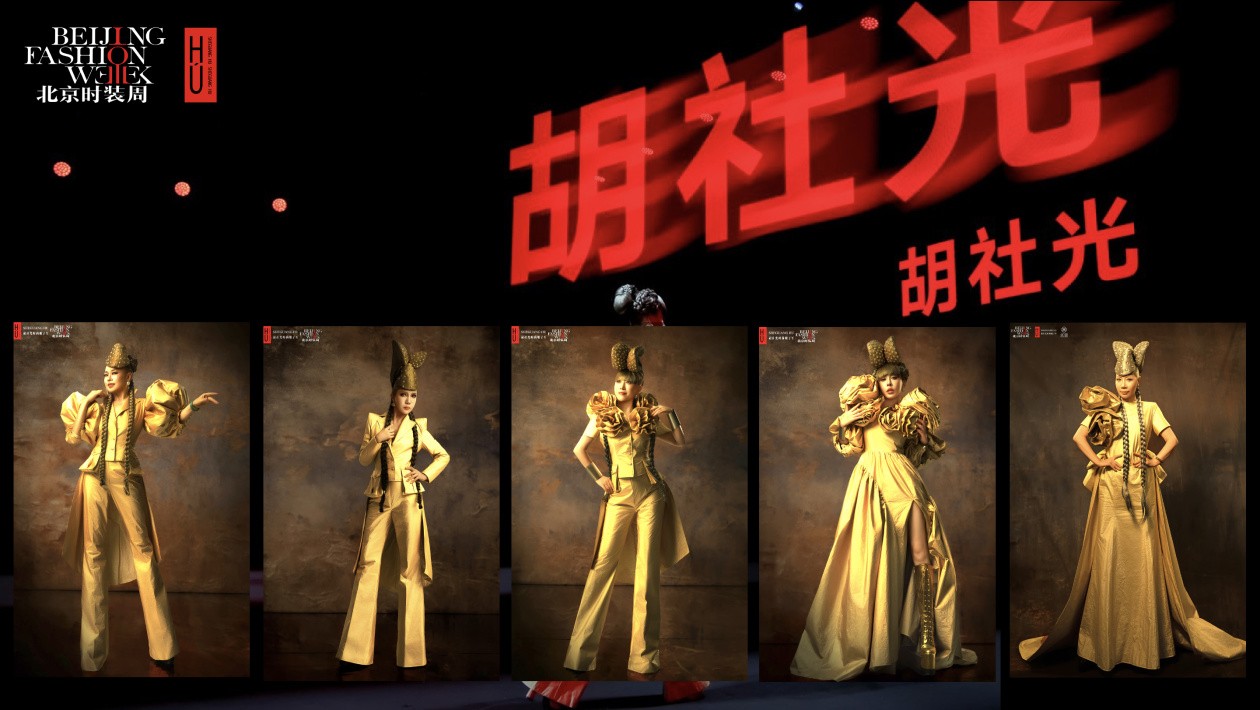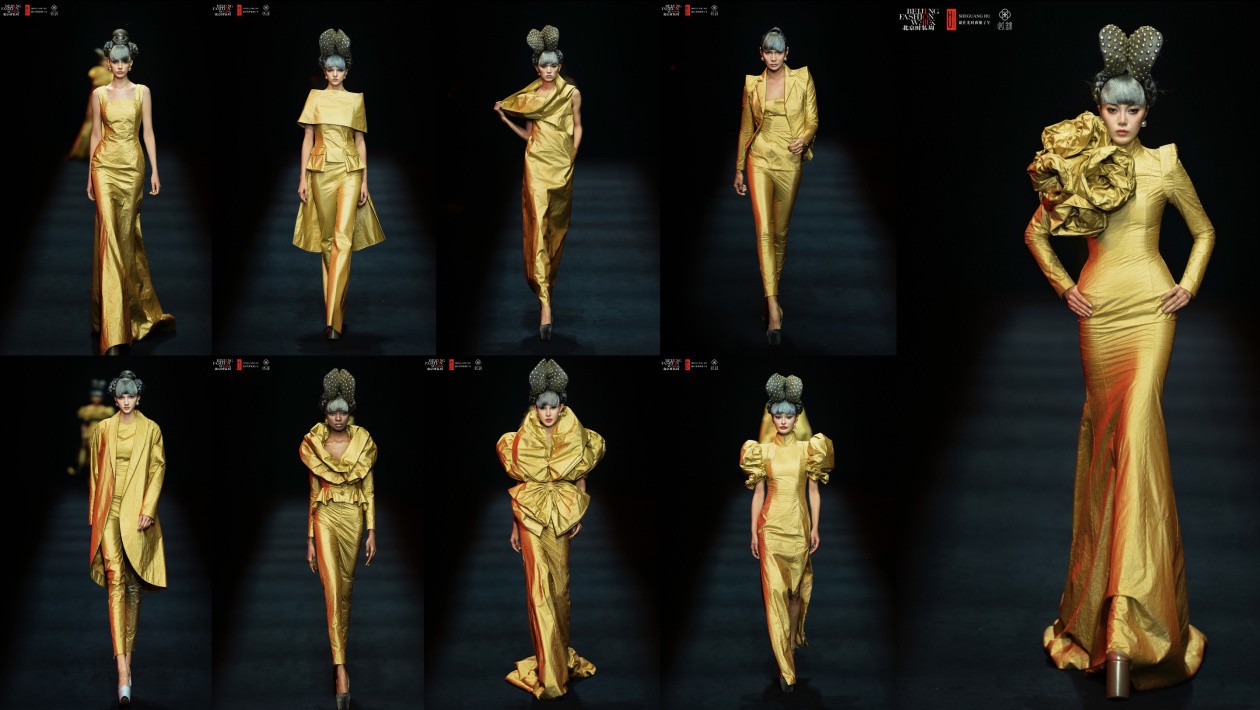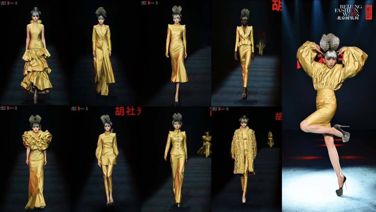 特殊处理的金色杜邦纸化身为“光铄”篇章的服装面料,兼具前沿环保理念、未来科技感光泽与极致可塑性,不仅是可持续时尚的坚定宣言,更赋予经典设计当代生命力。将“纸张”运用在高级定制秀场,在百年时装史上屈指可数。科技感的光泽、可持续的环保理念、前卫的造型能力。用纸张做设计,最大的风险就是“破裂”。彩排过程中,普通女性穿上金色玫瑰装饰的大礼服走上T台,细节的“裂痕”本身就是一次“设计师共创”,也是时装界的行为艺术。从摩登锋利的都市套装到气势恢宏的艺术礼服,金色的玫瑰在设计中怒放,铆钉点缀的假发造型为「光铄」注入了强烈的时代力量感。胡社光时尚娘子军独特的东方气韵与国内外超模的先锋气质交织,在胡社光的转译下,经典轮廓在当代语境下焕发新生,尖锐地指向可持续的未来。