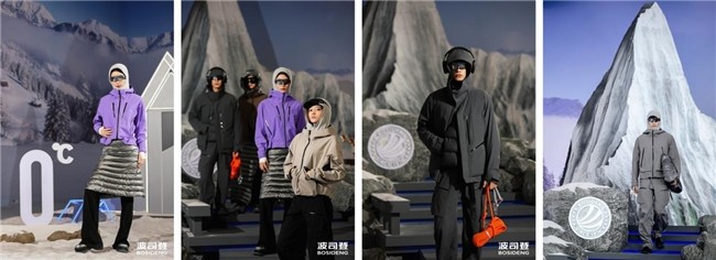沉浸式登顶雪山之巅的走秀形式,展现0℃下波司登叠变三合一的极致性能,在低温环境下,内胆外壳全套叠穿,不惧严寒,锁住身体热量,活动依然自如。