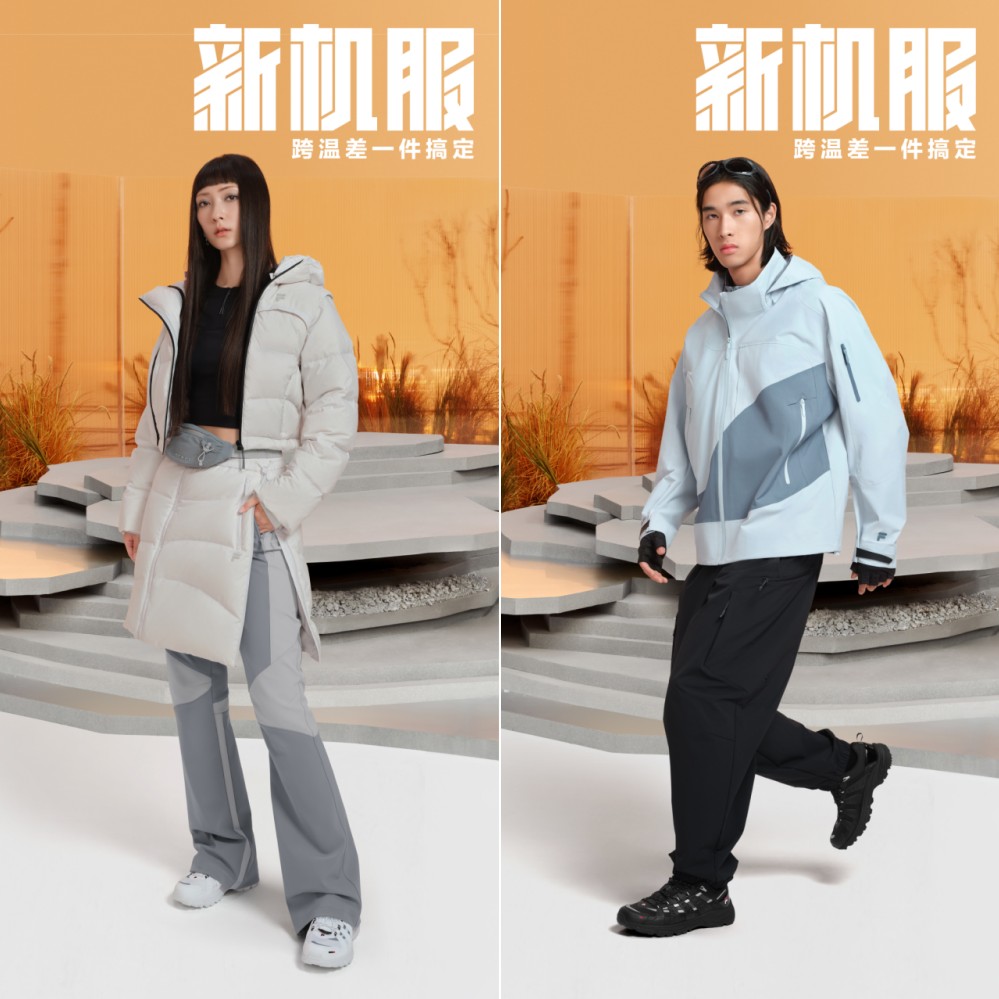 中间层的轻量保暖内搭则展现了FILA FUSION对“轻暖”哲学的深刻理解。创新性地采用THERMOLITE®科技面料,其结构灵感源于北极熊绒毛,独特的中空纤维设计有效锁住空气,形成高效保暖层,同时显著减轻衣物负重。内里精选90RDS优质鸭绒填充,绒子含量高达85%,蓬松度超700,轻盈锁温,无感穿着。可拆可合的设计,真正实现从室内到户外、从微雨到严寒的全场景包容,提供“可加可减”的温度自由。系列中的机能伞裤延续上窄下宽剪裁,优化比例、包容多元体型,简洁利落,成为连贯通勤与户外风格的基底单品。