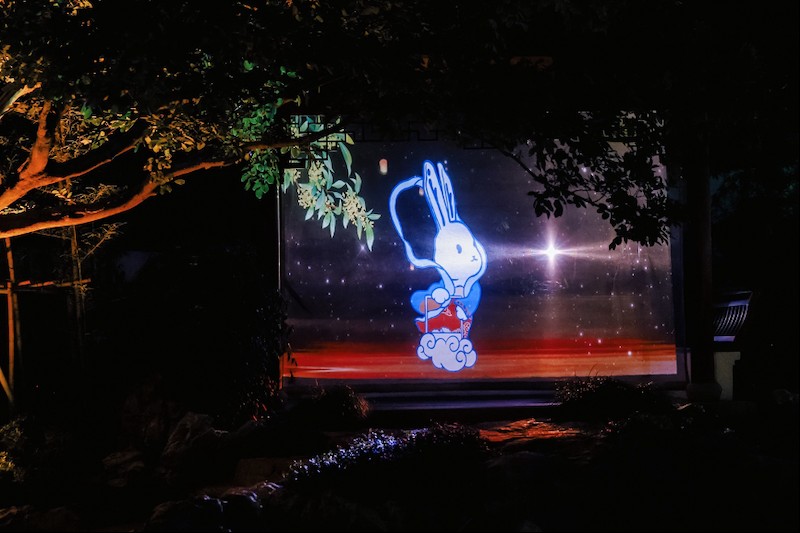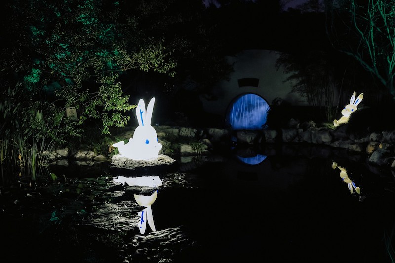 翠影摇月,白兔跃枝。这一处,则跳进了大白兔66周年的时光糖纸梦境。进入“翠竹吟”的幽静角落,在流水桥畔和密竹光影间,经典形象的大白兔轻快跳蹦,跃过月型桥洞,转瞬在竹林深处“焕然一新”。焕新IP形象化身中秋兔,在林间闪耀,追月而升,跳入奶香弥漫的梦幻世界。