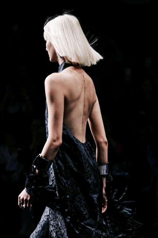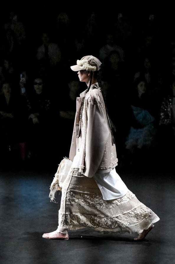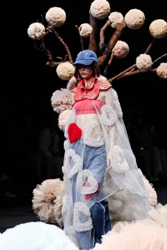 暗黑牛仔外套内里绣有若隐若现的粉色爱心,皮质短裙的磨损爱心口袋盖暗藏反叛。设计师以“藏”代“显”,让甜美元素成为酷感态度的隐秘载体。
