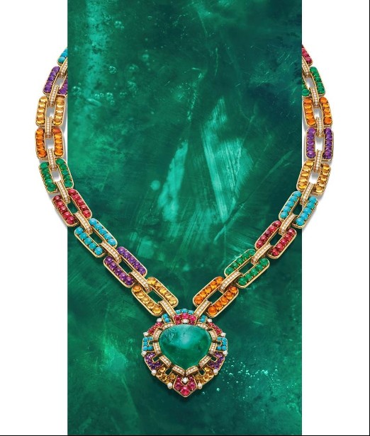 宝格丽凭借一件件瑰丽华美的珠宝佳作,将色彩之美升华为一种颇具格调的艺术表达。自品牌诞生伊始,对斑斓宝石的大胆运用便贯穿其发展脉络,且至今依然是宝格丽高级珠宝创作的主要灵感源泉。回溯品牌早期,创始人索帝里欧·宝格丽(Sotirio Bulgari)先生的作品已然展露出对色彩的热忱,随之,真正的色彩革命在20世纪正式拉开帷幕。20世纪初,传统高级珠宝界普遍偏爱铂金材质与单色设计,配色方案往往较为局限且趋于保守。20世纪50年代,宝格丽率先突破传统,大胆地将蓝宝石、红宝石和祖母绿镶嵌于黄金材质之上,与璀璨钻石相映生辉。宝格丽亦青睐紫水晶、黄水晶和绿松石等色泽明艳、富有美学表现力的宝石,将这些宝石引入珠宝创作之中,并以标志性的凸形蛋面切割工艺充分展现它们的色彩魅力。这种对色彩的大胆探索与运用,不仅成为了宝格丽风格的鲜明印记,更由此奠定了品牌“彩色宝石大师”之盛誉。