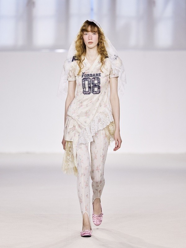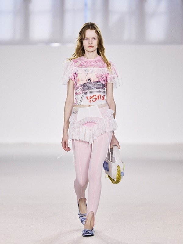 蕾丝与漫画元素巧妙融合,将恋爱中的浪漫气息悄然释放;而对蕾丝与运动元素的解构重组,也正是FORDARE极具辨识度的经典设计语言;Slogan T恤系列传递多元态度——略带调侃的趣味表达“love is ok”、“塑料关系”;也有“best woman”、“永远的爱”所承载的真诚期许。3D打印胸衣凭借独特造型,诠释出本季主题下强大的纯爱战士形象。此外,本次秀场携手陶瓷品牌it doesnot matter,共同探索配饰领域的新可能。