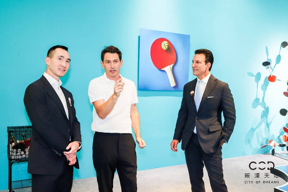 新濠集团主席兼行政总裁何猷龙先生,法国当代艺术家洛朗 · 佩博斯先生和澳门新濠天地总裁高添文先生于“乒乓花园”展区