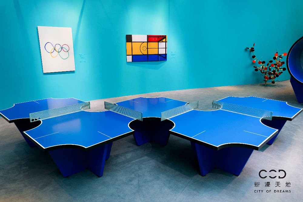 在第十五届全国运动会即将于粤港澳大湾区盛大开幕之际,《动竞艺境》以艺术语言回应竞技精神,为澳门奏响跃动的文化前奏。展览由三个核心展区构成:“梦幻球场” 呈现佩博斯专为新濠天地打造的装置作品《区域》,以网球场为灵感,通过草皮铺陈与空间错置营造出沉浸式场域,观众仿佛置身于颠倒的网球世界。“身体神话” 巧妙运用视觉错觉的原理,重塑运球中的维纳斯,并将篮球元素解构重组,创作出古希腊英雄与神祇的头像雕塑。通过这些在当代审美下的偶像符号,佩博斯既塑造出新的美学形象,同时也以矛盾与反讽的修辞,幽默地回应这种当代美学。“乒乓花园”则打破既有的竞技规则,将球桌扭曲、折叠、延展,创造出充满游戏感的互动场景。其中,装置作品《拼图》由三张乒乓球桌拼接,可容纳七人同场竞技,鼓励观众以互动和游戏的方式展开交流与思考。