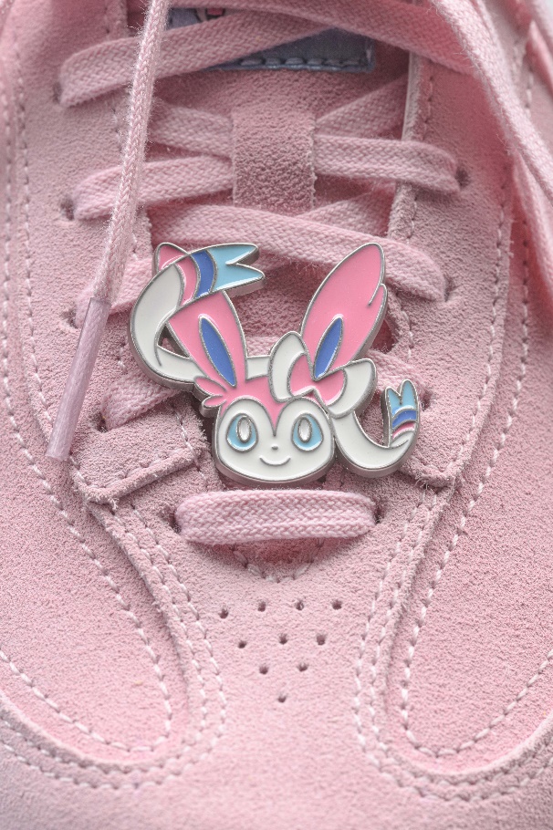 女子老爹鞋款选取轻便舒适的猫爪LITE 3、曲奇与蜜糖3三款,分别与“胖丁”、“皮皮”、“伊布”三个角色融合,呈现时尚甜美风格。鞋款设计皆呼应其对应角色形象色彩,并在鞋舌以闪卡点缀,在走动时呈现角色形象与剪影动态效果,不同光线角度下呈现出灵动光泽。各鞋款结合角色特点制作配饰,猫爪LITE 3融入“胖丁”灵动可爱特点,饰以圆滚滚胖丁的挂件与音符挂件,走动时挂件的碰撞发出美妙的声响,寓意“抚平压力,带来宁静”;曲奇面包老爹鞋型呼应“皮皮”圆润与粉色的形象特点,随鞋所配球球鞋带亦呼应其角色圆滚滚造型,并以可爱耳朵造型点缀鞋后跟;蜜糖3 以“伊布”标志性的棕色系为主调,鞋侧剪影暗纹、后跟处精致伊布头像、可拆卸鞋带饰扣,满足个性化穿搭需求的同时,鞋款更加灵巧动人。
