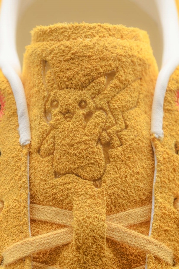 男子鞋款则选取潮跃面包鞋与惟吾LITE板鞋为创作蓝本,鞋款自带EVA回弹中底使其兼具舒适脚感与潮流属性。两鞋款分别以“小火龙”“卡拉卡拉”“耿鬼”与“皮卡丘”为色彩主调,鞋舌与鞋身分别点缀其挂饰与闪卡或剪影,细节处处彰显设计巧思。其中,“潮跃”鞋款分别在鞋身与鞋后跟融入“小火龙”“卡拉卡拉”“耿鬼”标志图案,以多样形式呈现角色特征。其次,融合“耿鬼”的“潮跃”鞋款更是创意制作出具有散点泼墨反光效果的鞋底,增添闪光拍摄时的酷炫魅力。惟吾LITE款式将“皮卡丘”闪电元素融入鞋身与挂饰设计中,闪光灯下,闪电元素更加酷炫,使经典角色活力以更具现代感的方式呈现。