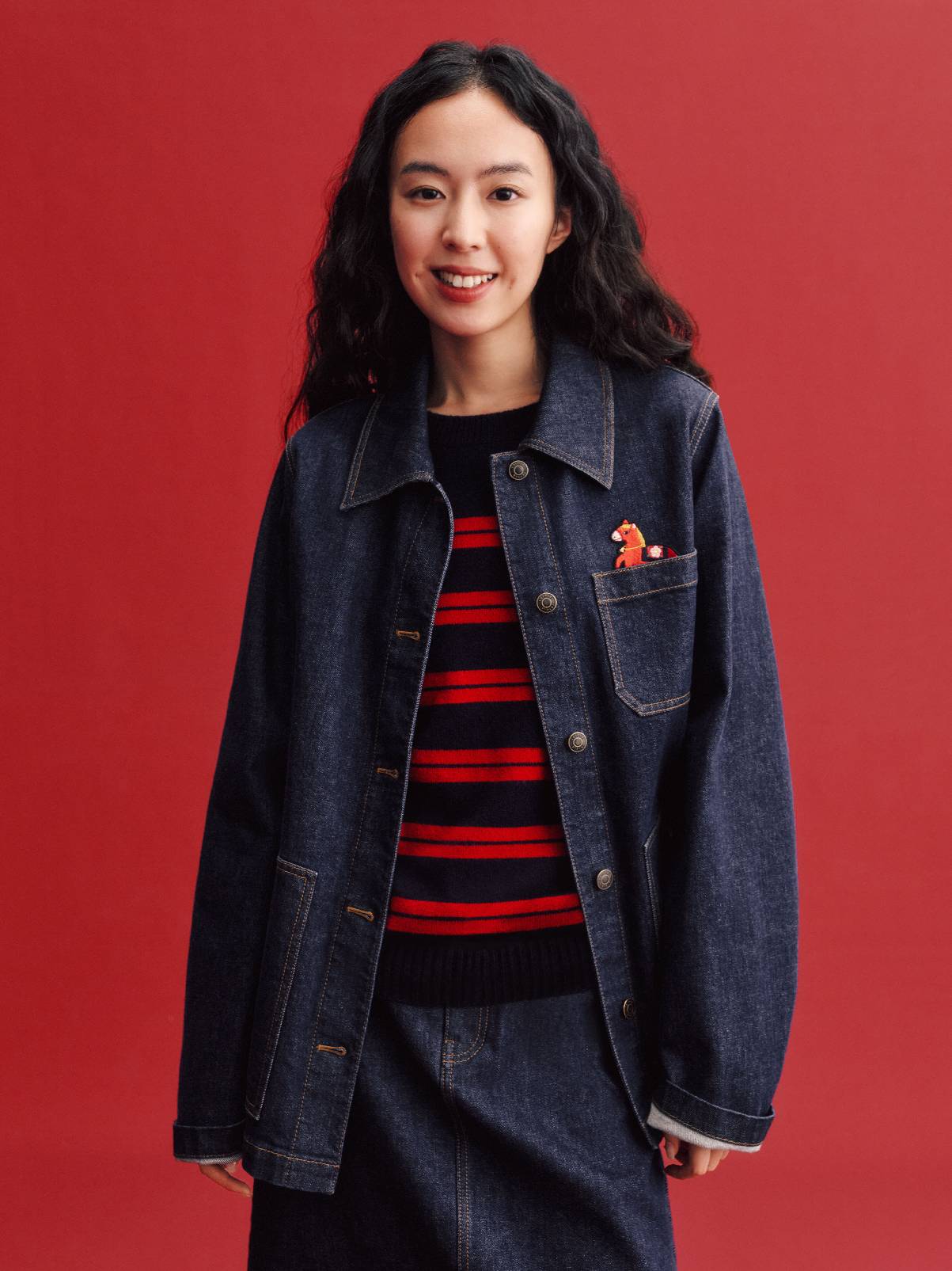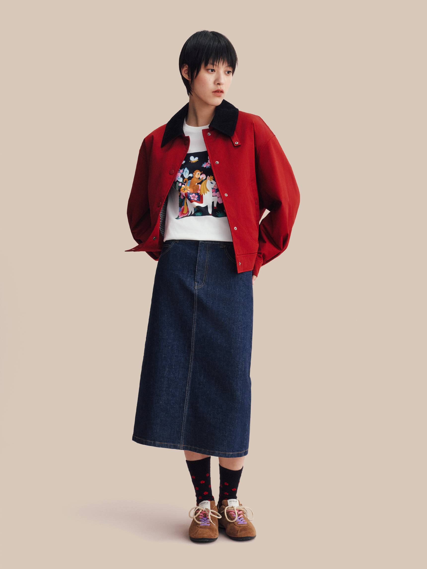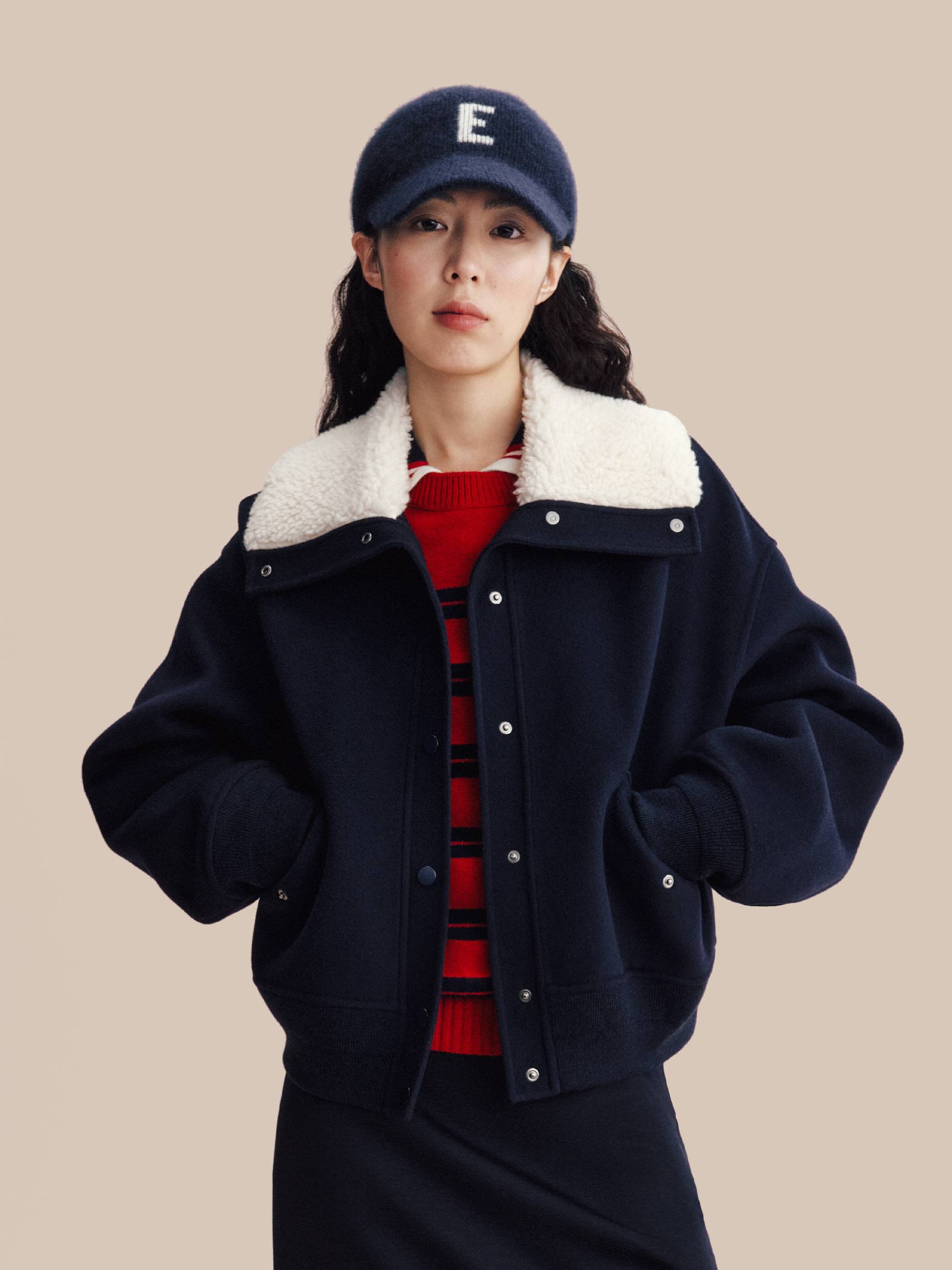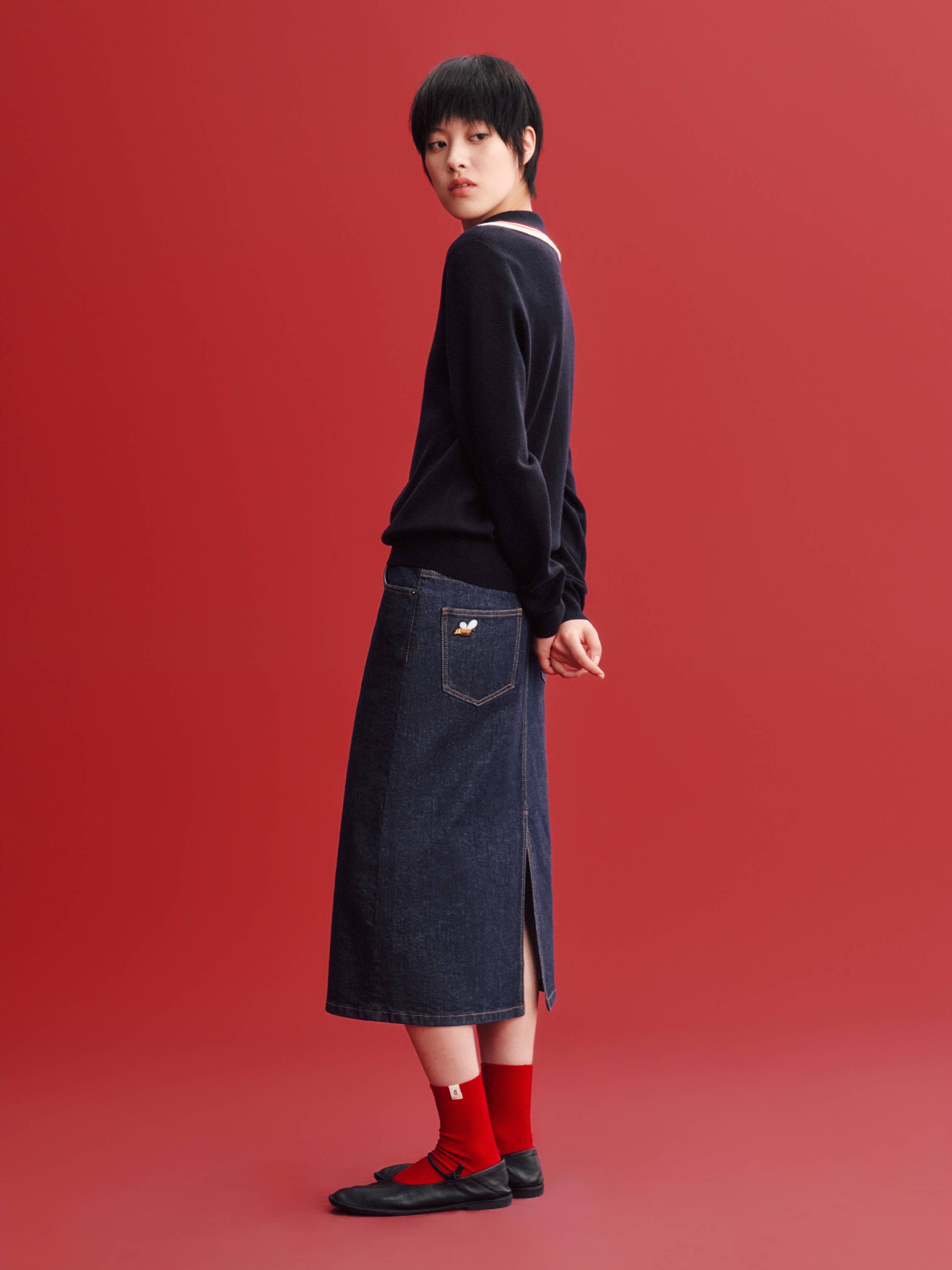 新年团聚的温情,与本系列的舒适哲学相融,共同诠释轻松愉悦的节日着装语境。羊毛双面呢开衫、棉质斜纹卫衣、水洗牛仔过膝裙与裤装,搭配拉毛围巾、棒球帽与报童帽等配饰,呈现出一系列兼具复古气息而松弛态度的新年着装。正红基调延续热烈而饱满的传统表达,米白、深蓝与深灰的融入,平衡出沉稳而现代的色彩层次。精致刺绣与羊绒条纹巧妙呼应,在工艺与材质中交织传统与当下,呈现出一系列兼具文化厚度与审美温度的新年着装——以一年一度的新衣仪式,开启共同憧憬的锦绣前程。