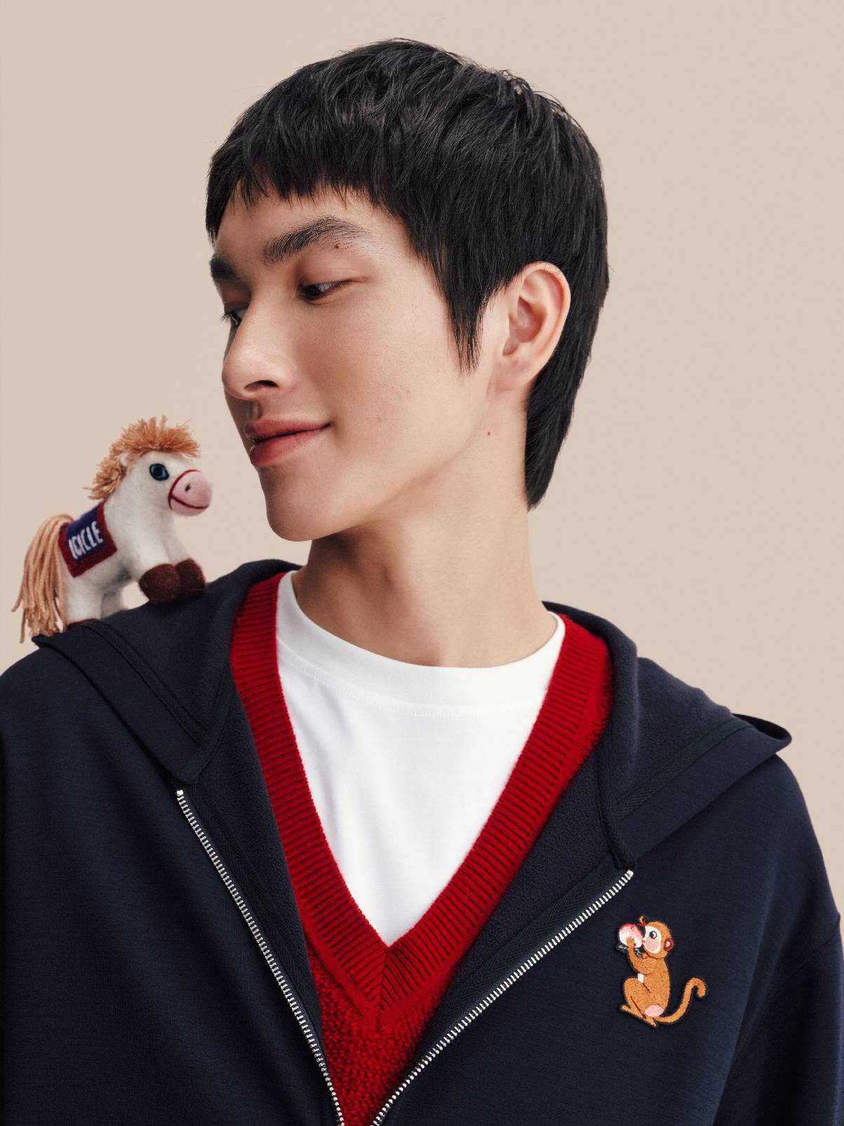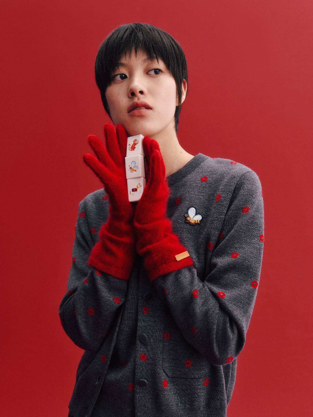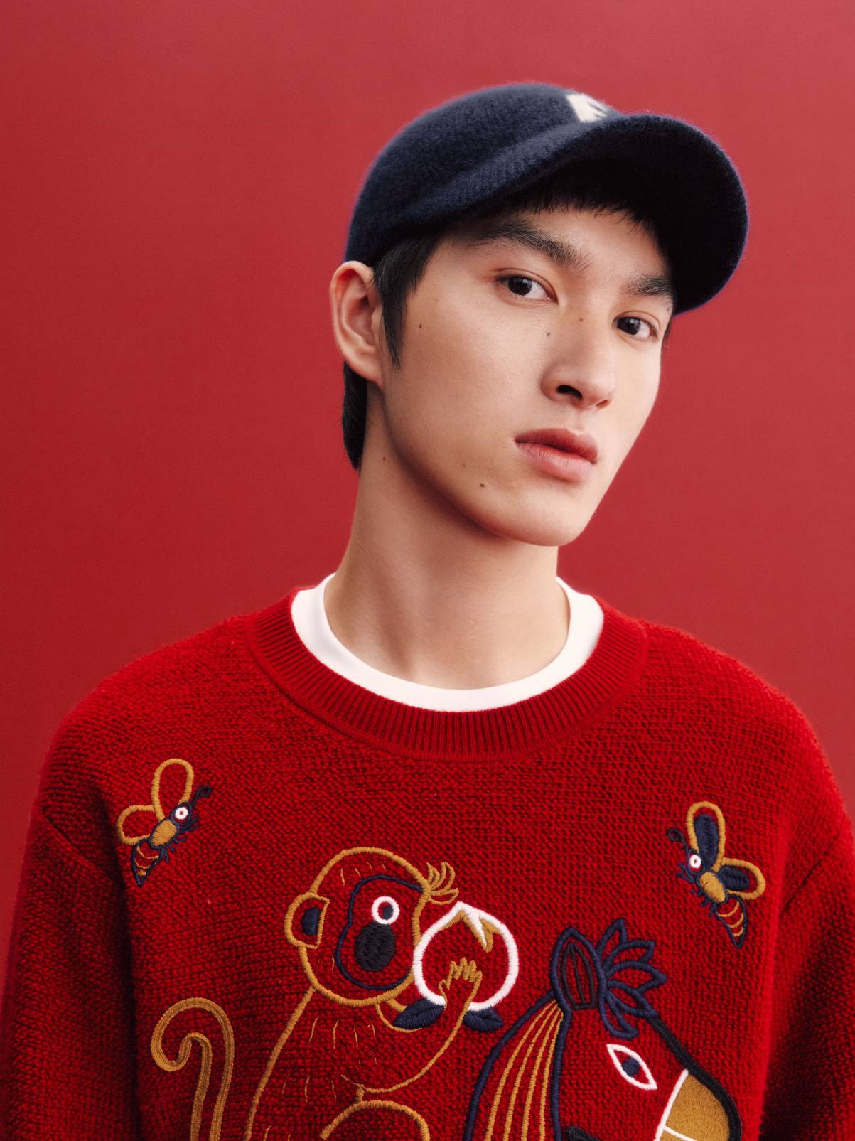 系列以时装设计语言转译画作精神,将《马上蜂猴》中猕猴、蜜蜂与繁花等稚拙的民谚元素,凝练为刺绣剪花,以精致徽标点缀于服饰,含蓄中见生趣。色盘以正红为主调,铺陈出浓郁温暖的节庆意境。羊绒条纹细腻灵巧,刺绣针织衫以精致针法勾勒主题元素;灯芯绒针织布与棉质毛圈材质则赋予织物丰富肌理与亲肤质感。条纹灵感取自蜂纹,红白相间的线性语言跃动其间,为造型注入清新活力,寄托对新年的轻盈憧憬。