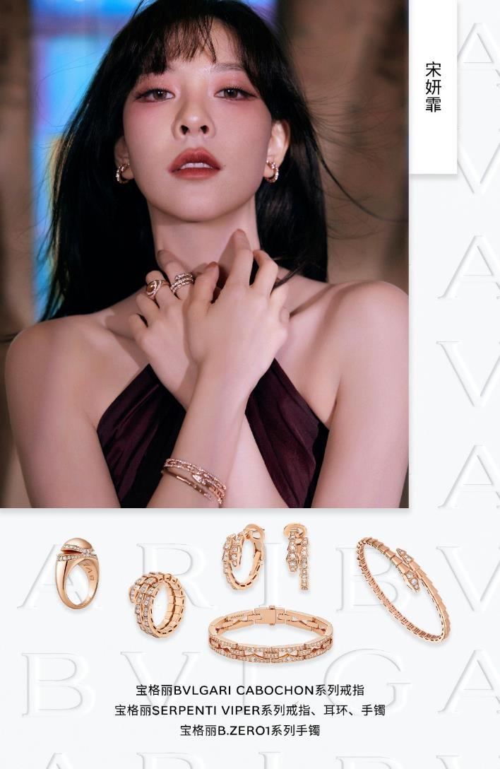 欢悦节奏,谱写节日旋律。宋妍霏叠搭Serpenti Viper系列与B.zero1系列手镯,钻石辉映18K玫瑰金光芒,为节日氛围更添璀璨。于文文、王霏霏皆佩戴Serpenti Tubogas系列腕表,灵蛇以焕新之姿盘桓腕间,于绰约光影中奏响新年主旋律。