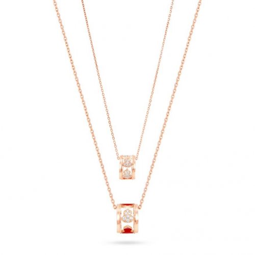 本季新品项链,其环形吊坠采用阶梯镂刻工艺,线条层层递进,呈现出富有节奏感的立体结构。钻石切割链条线条流畅,与吊坠形成虚实对比,使整体造型更显灵动。品牌标志性的“麒麟红”HyCeram®陶瓷与钻石相互映衬,温润而不张扬,为项链注入柔和的色彩层次。