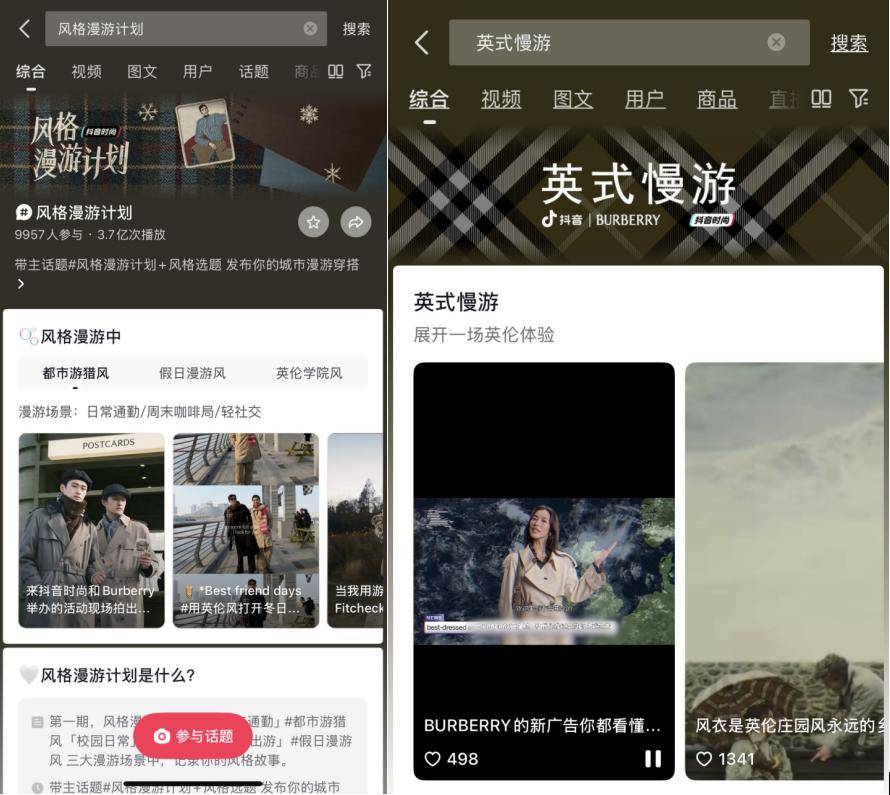 近期,抖音时尚发起「风格漫游计划」,聚焦城市通勤、校园生活、户外出行三大高频场景,通过 #都市游猎风、#英伦学院风、#假日漫游风 ,邀请创作者与用户共同探索穿搭与生活场景的深度结合。与此同时,抖音时尚也与BURBERRY展开以「英式慢游」为主题的线上线下联动,在2026年开端,让风格不止于观看,更成为可参与、可体验的生活内容。