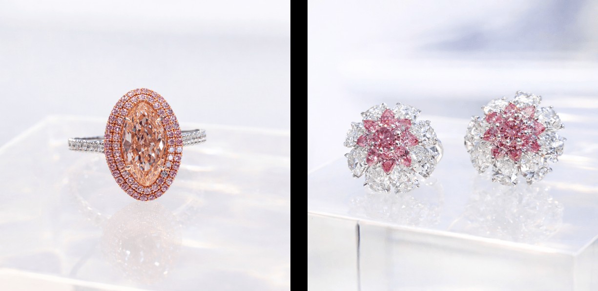 高级珠宝品牌Martin Katz的天然Moval切工沙漠钻石戒指与粉白相间的沙漠钻石耳饰