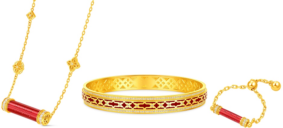 在中国传统文化中,爆竹以声响打破沉寂、迎接新生。这份破局重生的力量,随爆竹造型凝结于作品之中。周大福传承系列新春款,通过鎏彩工艺将红色提炼为珠宝视觉亮点,呼应爆竹的喜庆色彩及节庆氛围。鎏彩之上,黄金精雕“囍”字悄然织入,与爆竹元素相映成趣。爆竹声声,囍伴新春,共同编织新春的喧腾喜悦。