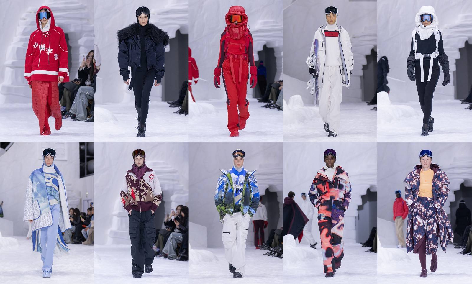 中国李宁2026秋冬大秀,以一段沉浸式场景开启旅程,这段体验始于充满复古气息的高山火车站氛围,检票口、站台指引牌、候车厅以及长廊尽头的小火车,无不唤醒宾客对经典冬季运动场馆的记忆,途经的小火车内还陈列了承载着李宁品牌高光时刻的经典领奖服展区,回溯中国体育的荣耀时刻。随着宾客深入秀场空间,环境的肌理逐渐从怀旧与暖色调转向受雪原和跳台滑雪场地启发所打造的极致辽阔的纯白景观,这一渐变式体验逐步拉高观秀期待。主秀场是一个以冬季运动竞技场为原型的广阔空间,其动态轨迹与空间张力取自专业滑雪赛道与运动员在巅峰时刻展现出的行云流水的运动姿态。这场沉浸式大秀既植根于李宁深厚的运动基因,也呼应品牌向体育精神、中国体育荣耀时刻及冬季运动的过去与未来致敬的宏大叙事。