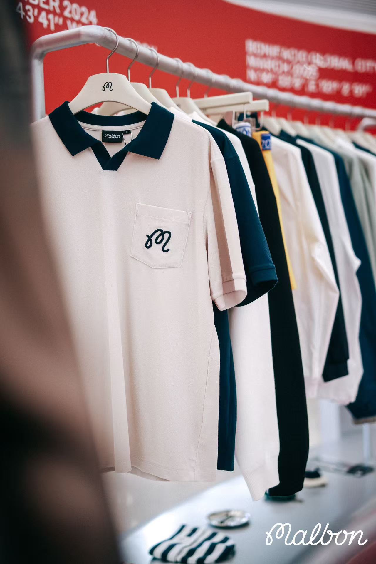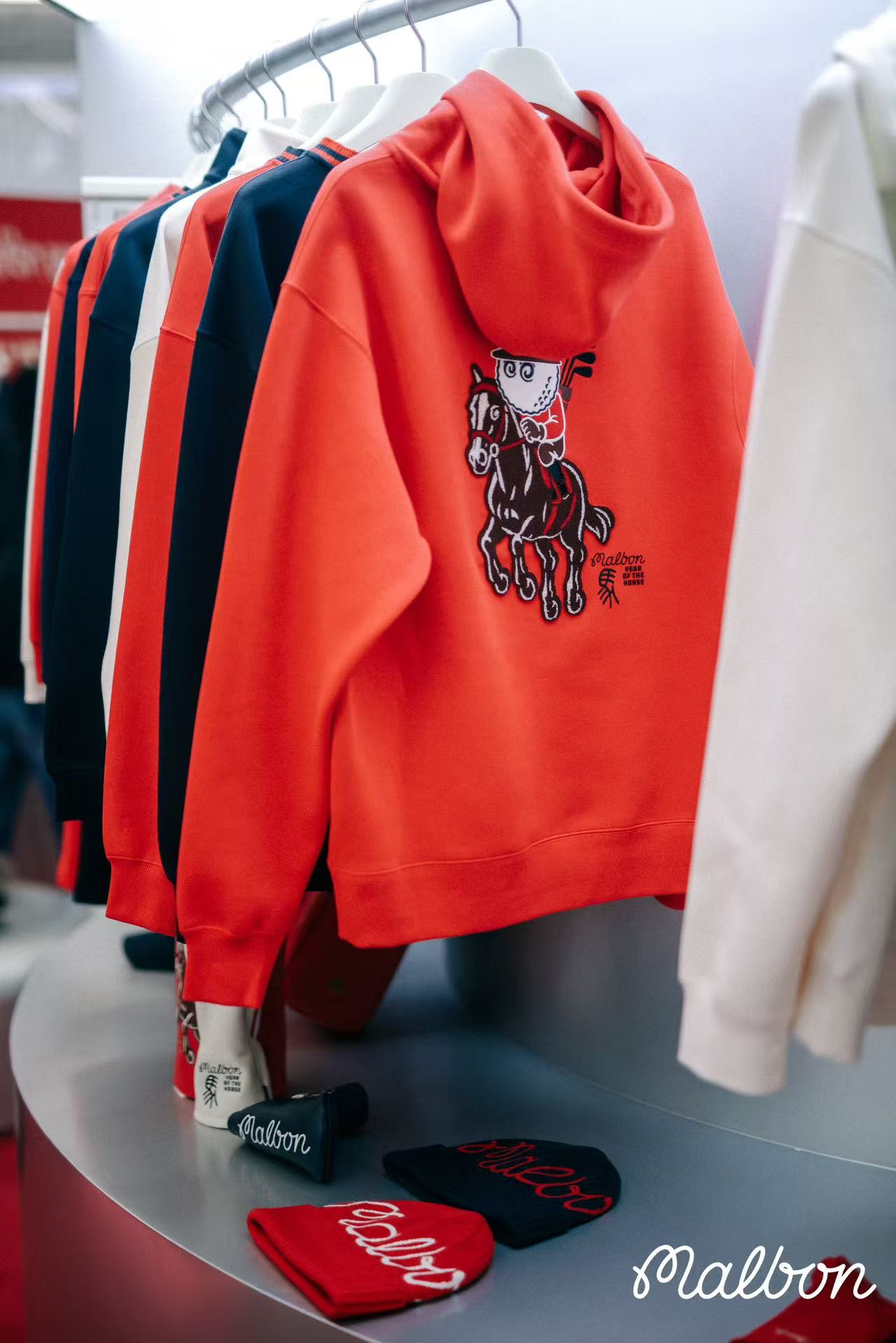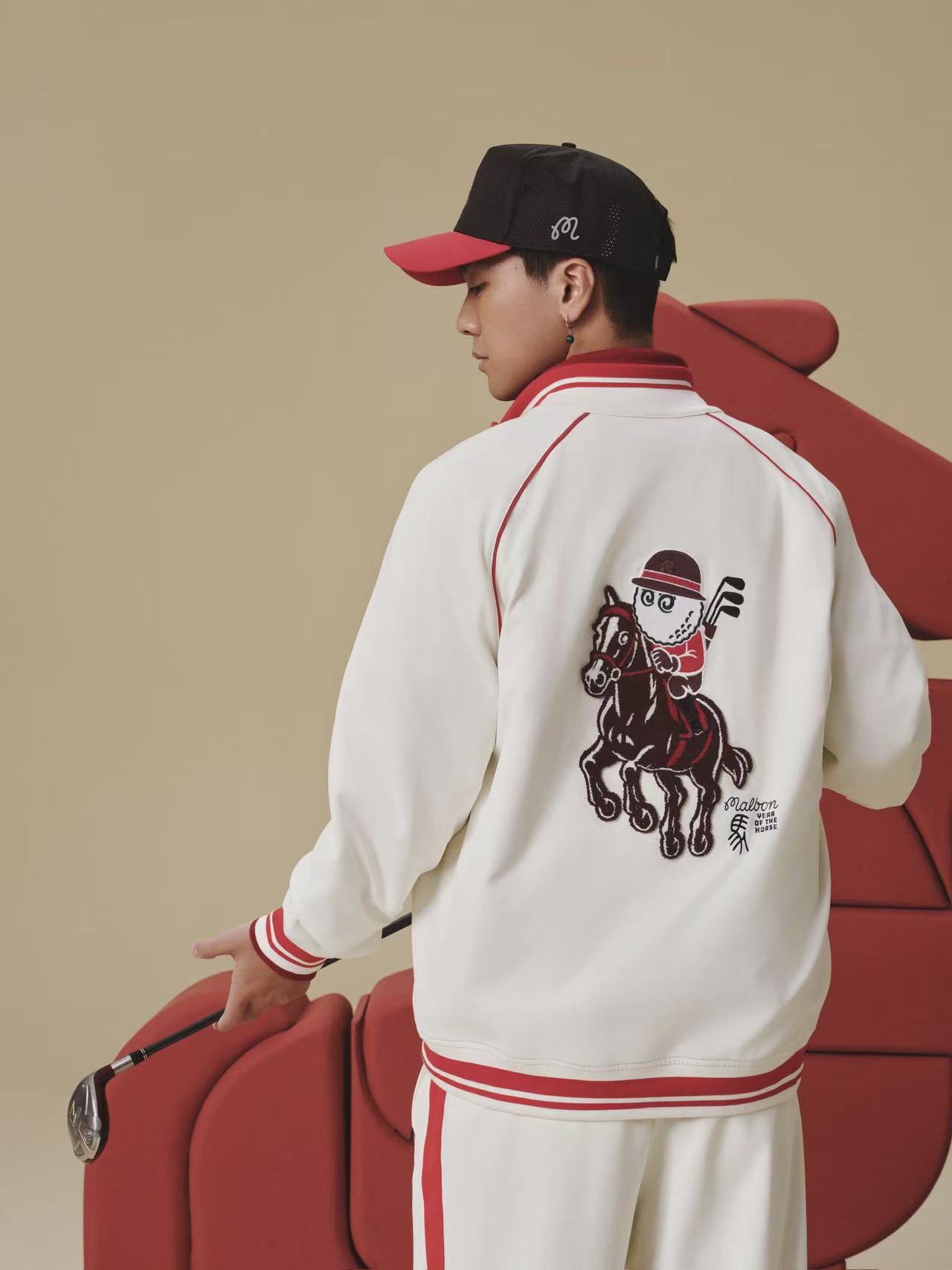 本次快闪空间的视觉焦点——Malbon 2026“中国马年”限定系列,标志着洛杉矶的设计基因与中国传统文化的一次深度对话。限定系列在设计细节上极具匠心:成人系列通过形似篆体“马”字的细节标识,演绎层次丰富的质感审美;而儿童系列则以充满好奇心的卡通画风,鼓励新一代勇敢探索未知。系列选用了代表节庆仪式感的中国红、深邃的藏青色以及优雅的象牙白作为核心色彩,并结合牙刷绣、光线包针绣等精致工艺,让高尔夫运动的质感在每一寸面料中自然流露。