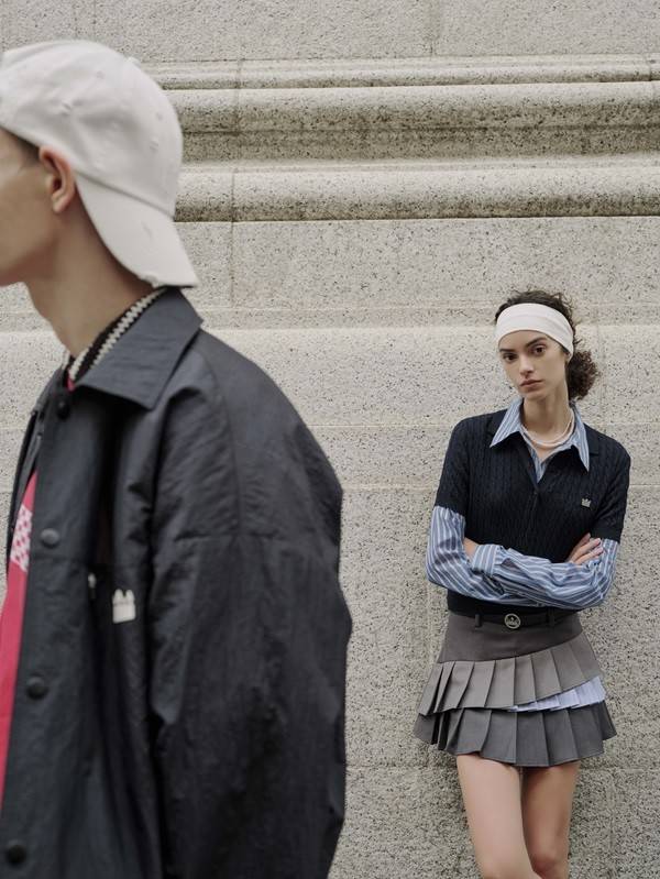短款外套以挺括耐穿的斜纹面料与无性别设计构筑廓形,打破性别与风格的边界,呼应“自主”态度,实现“一衣多穿”的实用主义;灯芯绒衣领与袖口的拼接设计,既呼应工装轻复古美学,亦为整体叠增层次与温度。穿着者可在外观与功能之间自主调节,在街头即景中书写属于自己的风格叙事。
