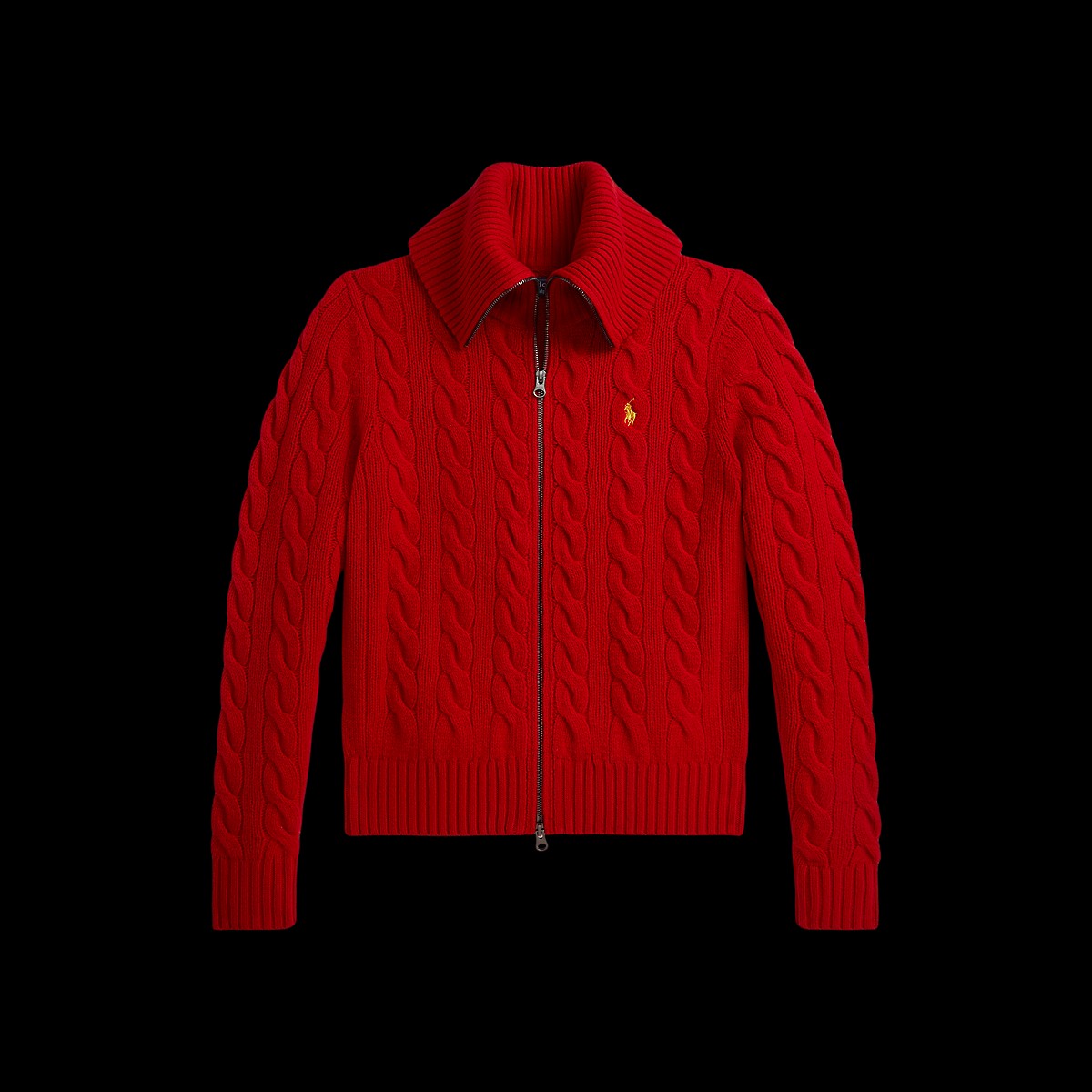 新年系列的全拉链针织开襟衫,采用经典绞花编结结构,配有夸张的翻领,选用雅致纱线织就,具有柔软的手感,胸前饰有以金色丝线绣成的标志性小马图案,富有节日气息。