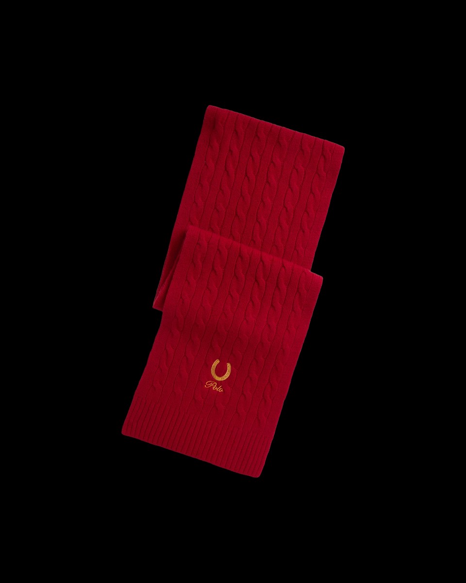 围巾饰有精美的马蹄铁图案和徽标刺绣,旨在庆贺 2026 年马年新年,选用柔软的毛纱线织就,采用经典绞花编结设计。