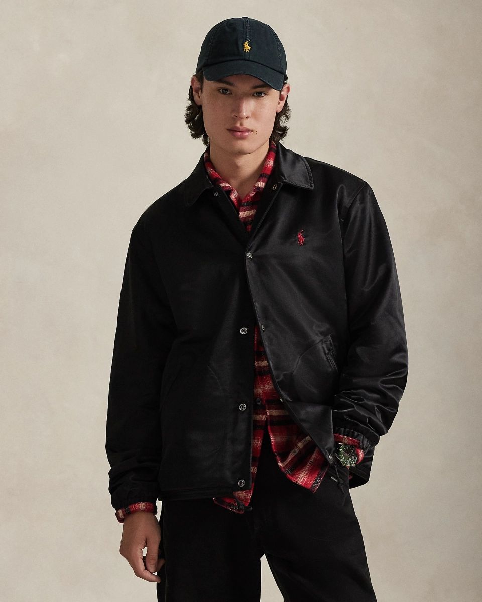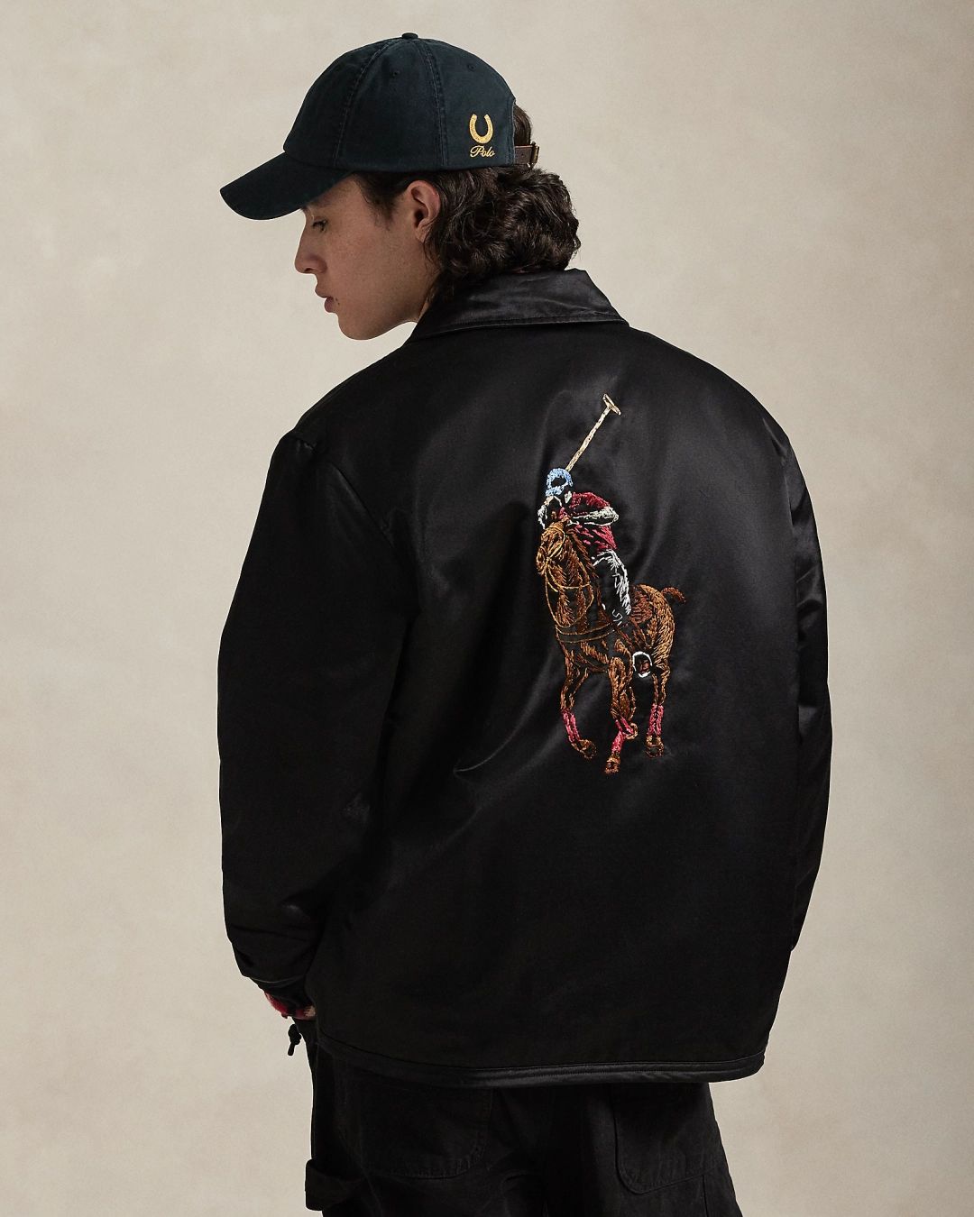 绸缎夹克饰有以乱针绣工艺打造的马标图案,巧妙融合传统手工刺绣与现代机绣技艺。乱针绣是苏绣的一种艺术演变,以其绘画般质感和富有表现力的技法著称,打造出富有纹理感的立体效果,呈现鲜艳的色彩过渡和细微的色彩差异,Ralph Lauren 与常州乱针绣博物馆及其第四代传承人吴澄合作,共同呈现传统工艺与现代设计的融合,为迎接 2026 年马年新年而推出一款别样夹克。