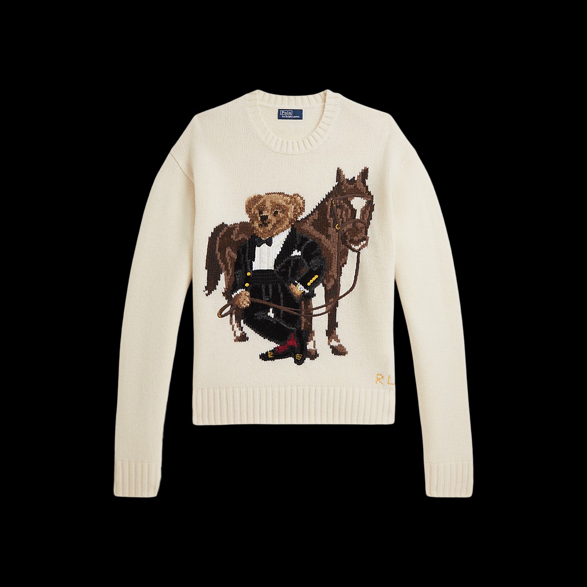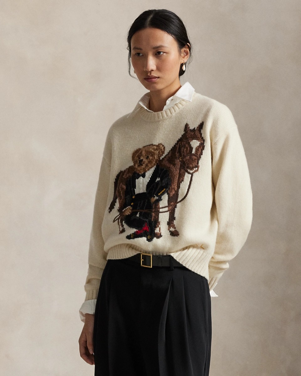 新年系列的圆领针织衫,饰有标志性 Polo 小熊图案,小熊身穿富有节日气息的 Ralph Lauren 服饰以庆贺马年,备受喜爱的吉祥物身穿无尾礼服,搭配红色袜子和精饰便鞋,站立于骏马旁边。