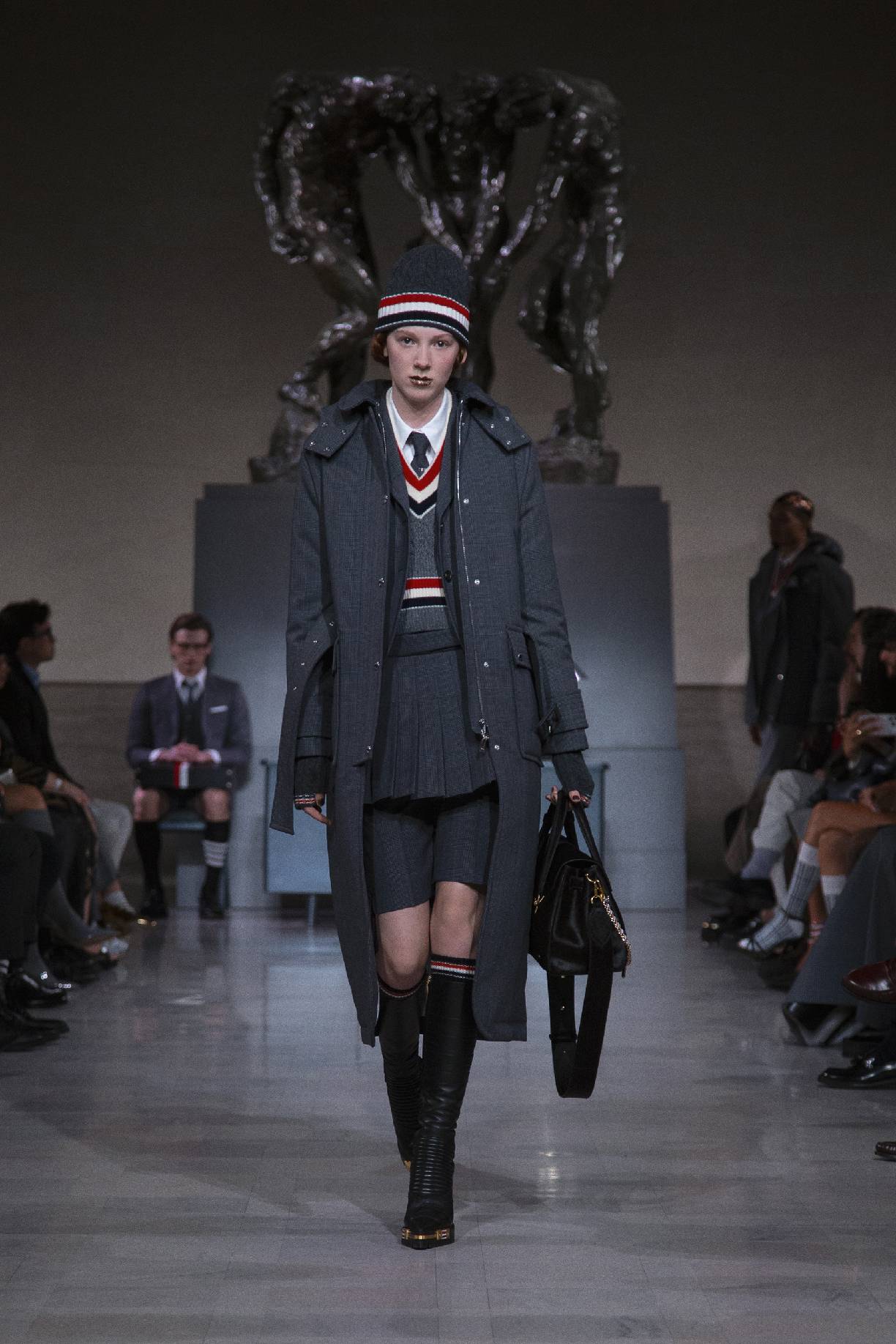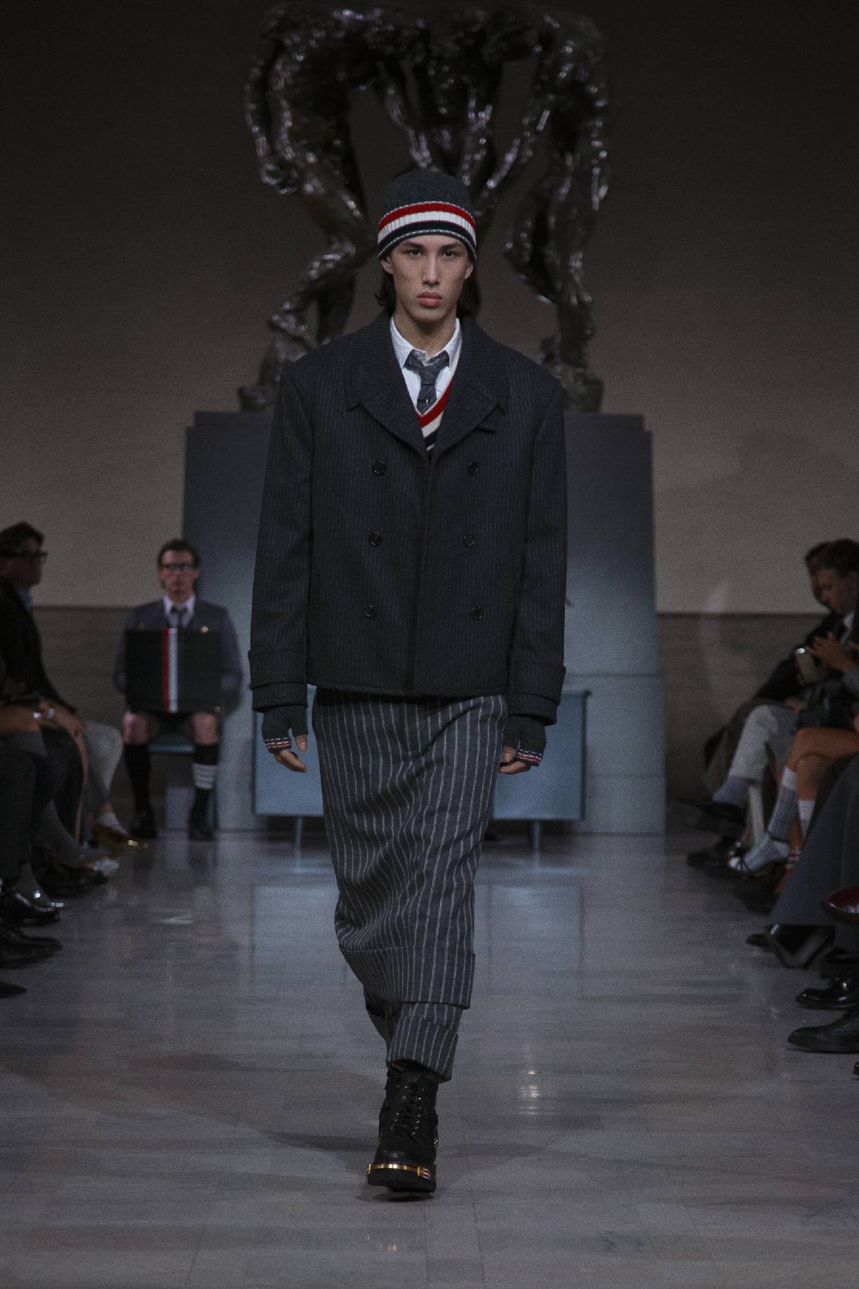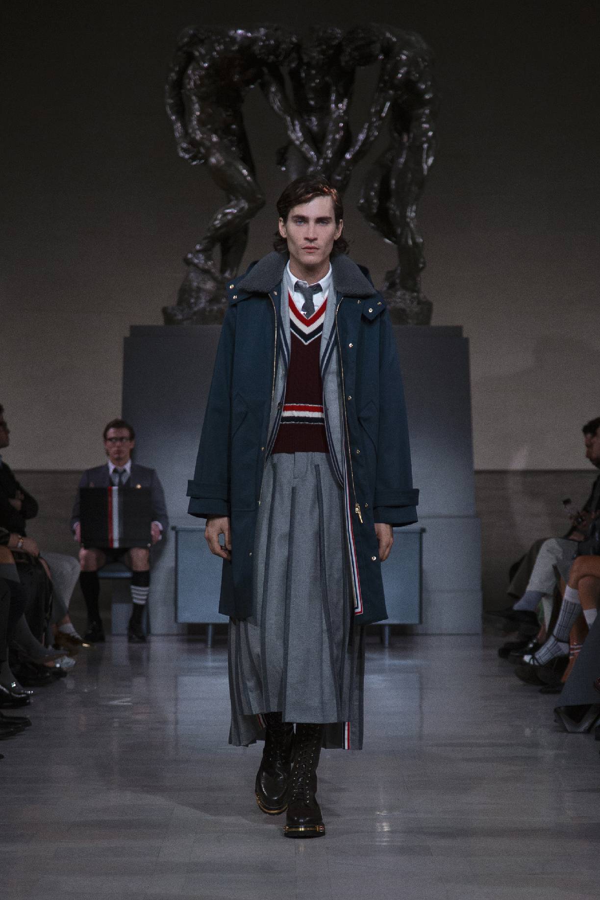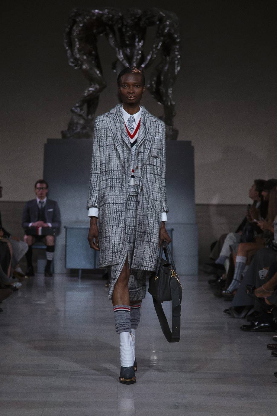 thom browne于旧金山荣誉勋位宫博物馆,在奥古斯特・罗丹(auguste rodin)的青铜雕塑《三个影子》下,正式发布 2026 秋冬系列。旧金山连绵的山峦与经典的城市景致,为这场秀定下独特基调。本次大秀于第六十届超级碗赛事前启幕,特邀 NFL(美国国家橄榄球联盟)球星德安德烈・霍普金斯(deandre hopkins)、贾斯汀・杰弗森(justin jefferson)等登台亮相,创作灵感皆源于对极致卓越的不懈追求。