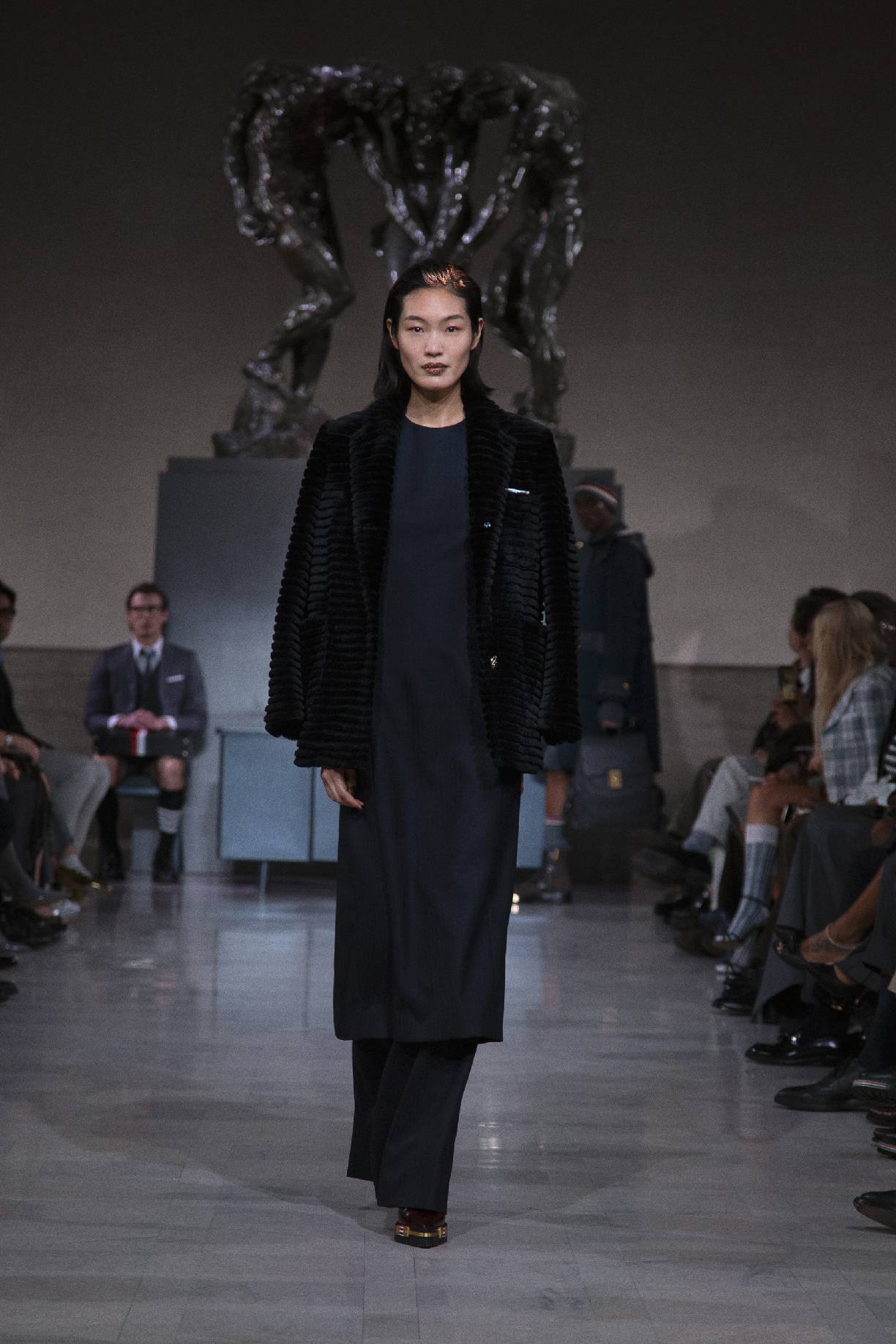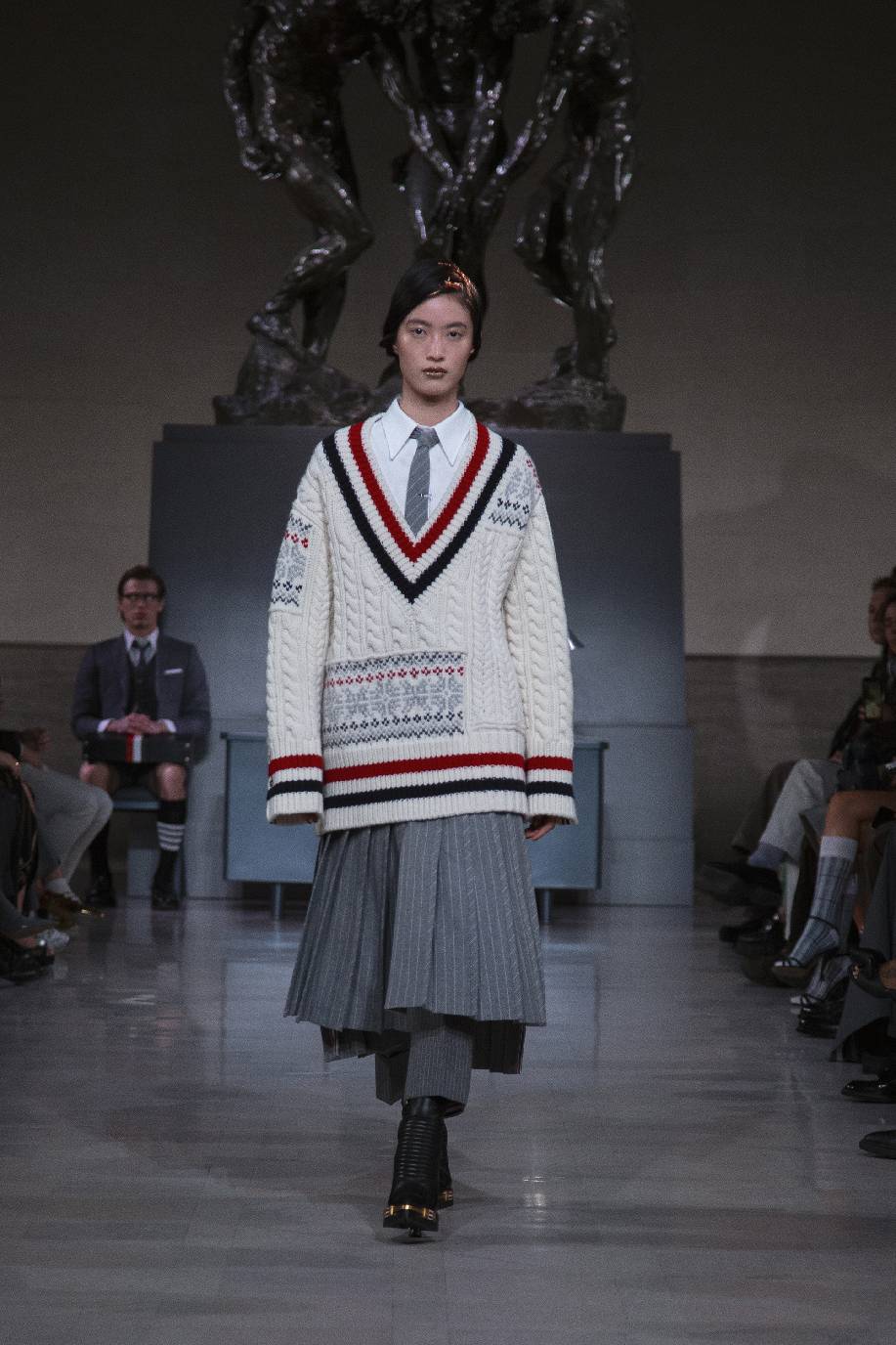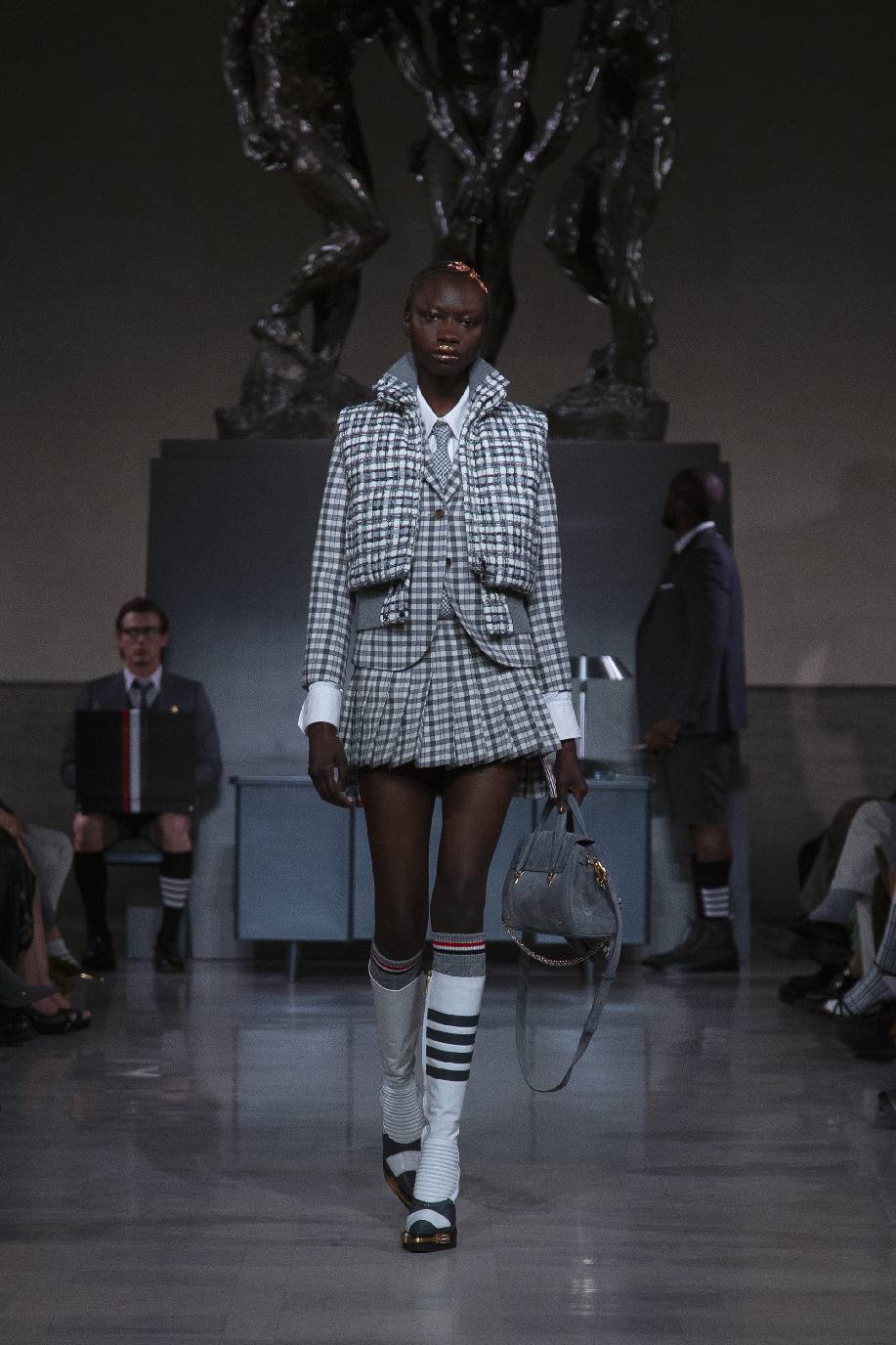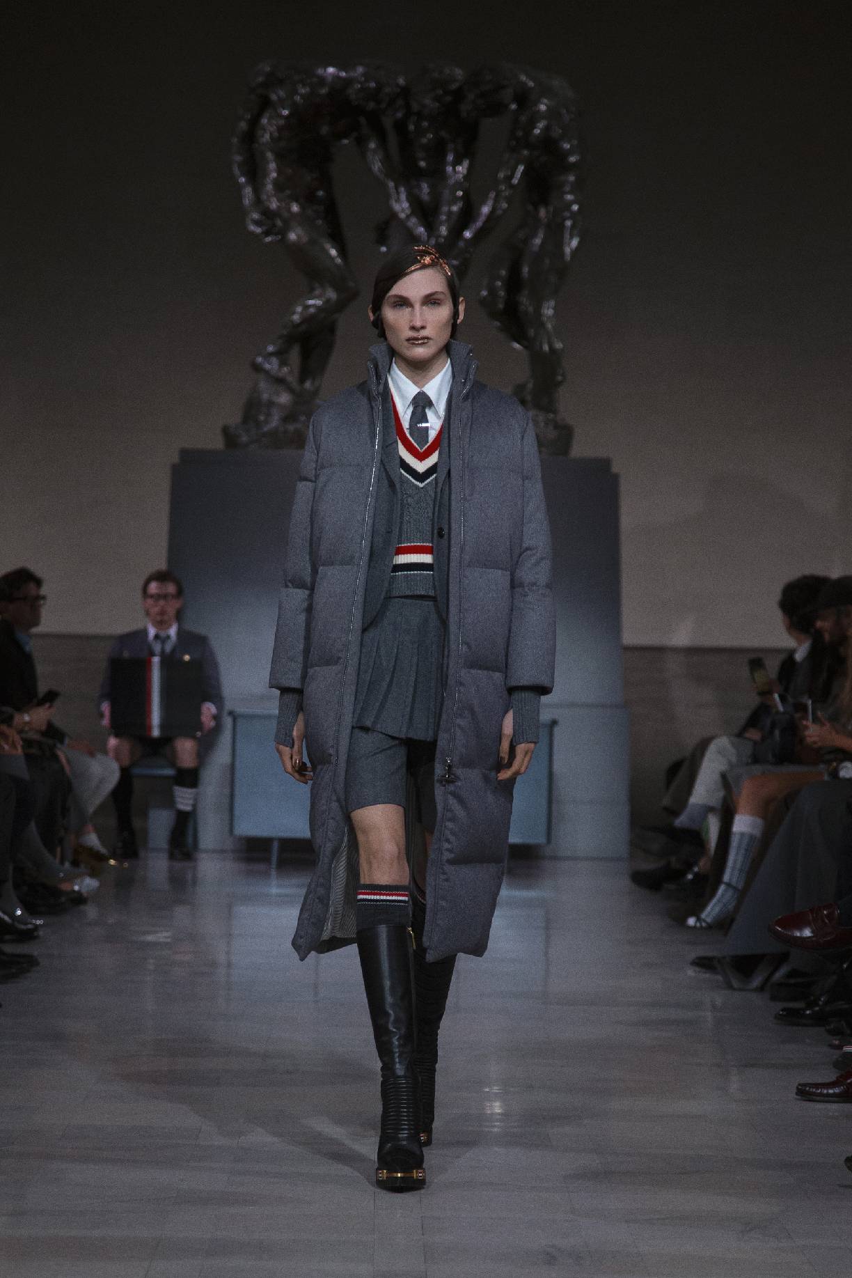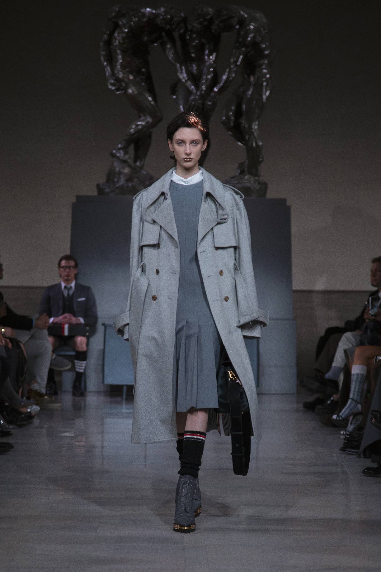 thom browne于旧金山荣誉勋位宫博物馆,在奥古斯特・罗丹(auguste rodin)的青铜雕塑《三个影子》下,正式发布 2026 秋冬系列。旧金山连绵的山峦与经典的城市景致,为这场秀定下独特基调。本次大秀于第六十届超级碗赛事前启幕,特邀 NFL(美国国家橄榄球联盟)球星德安德烈・霍普金斯(deandre hopkins)、贾斯汀・杰弗森(justin jefferson)等登台亮相,创作灵感皆源于对极致卓越的不懈追求。