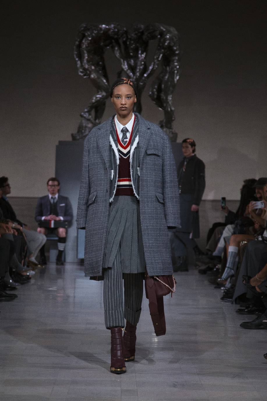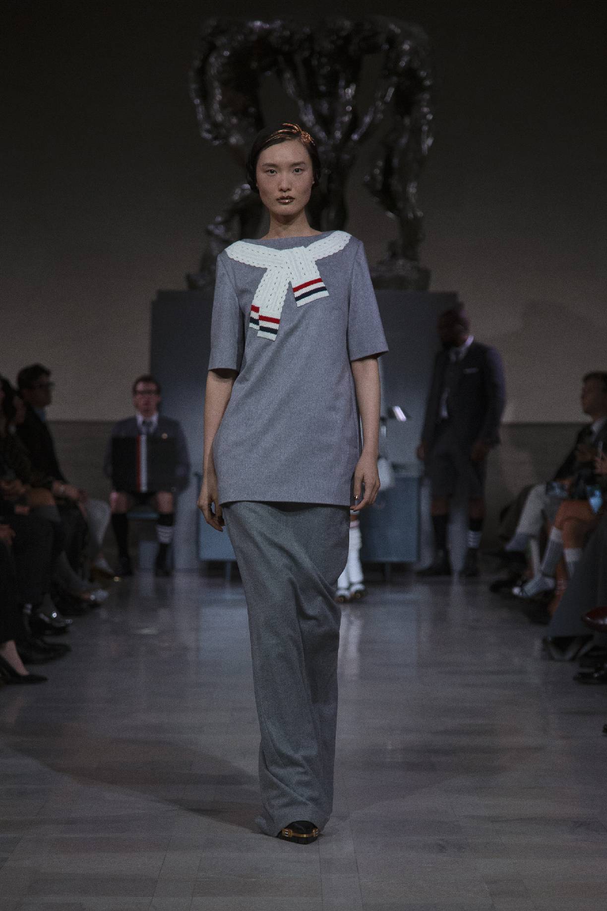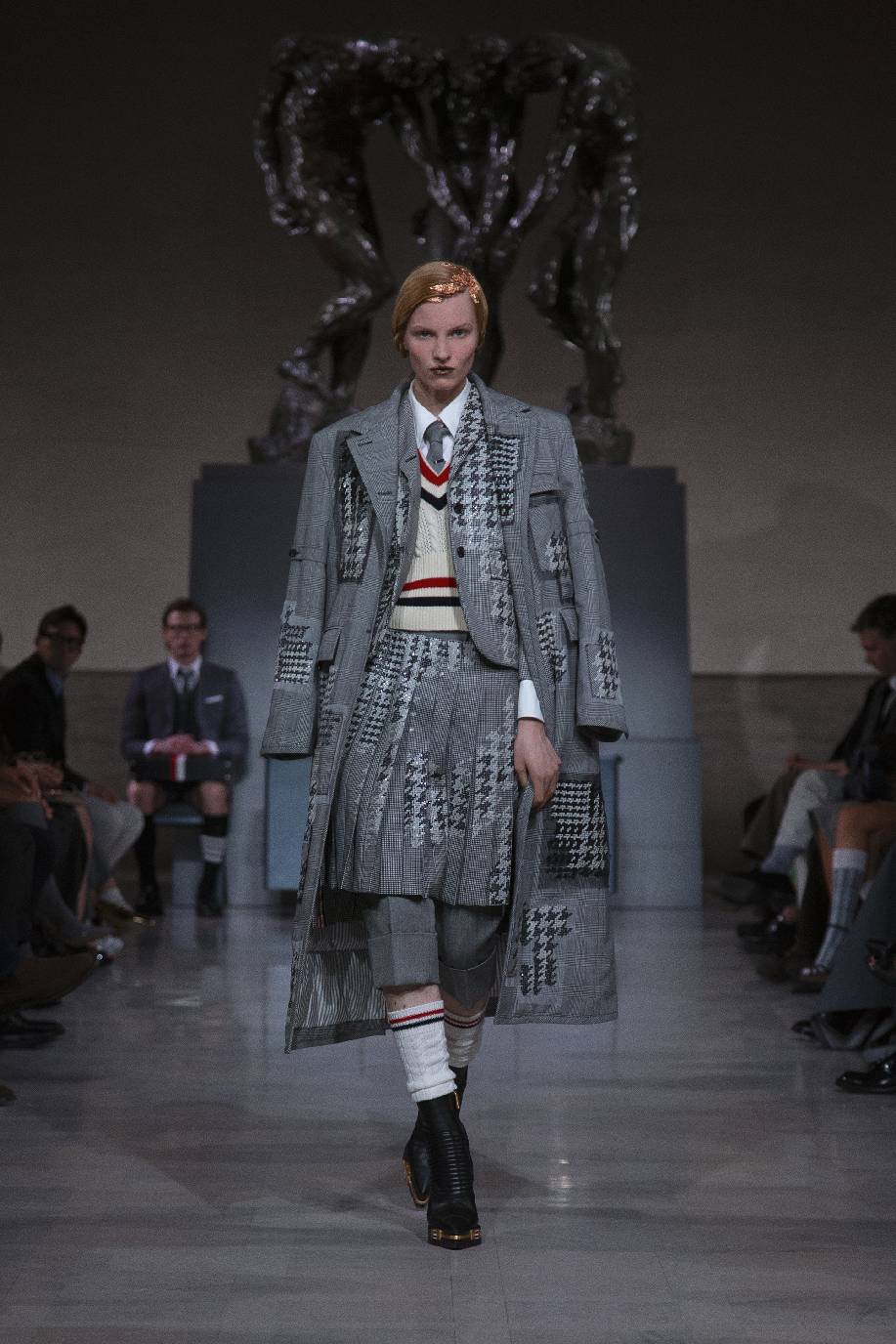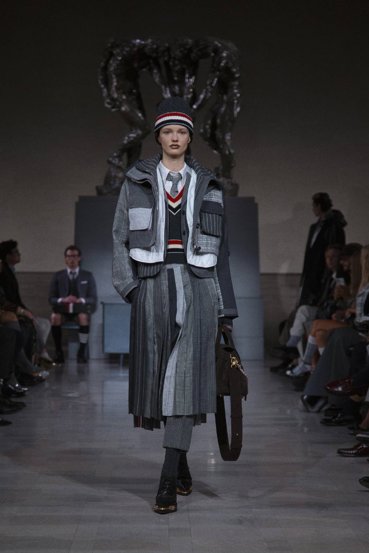 thom browne于旧金山荣誉勋位宫博物馆,在奥古斯特・罗丹(auguste rodin)的青铜雕塑《三个影子》下,正式发布 2026 秋冬系列。旧金山连绵的山峦与经典的城市景致,为这场秀定下独特基调。本次大秀于第六十届超级碗赛事前启幕,特邀 NFL(美国国家橄榄球联盟)球星德安德烈・霍普金斯(deandre hopkins)、贾斯汀・杰弗森(justin jefferson)等登台亮相,创作灵感皆源于对极致卓越的不懈追求。