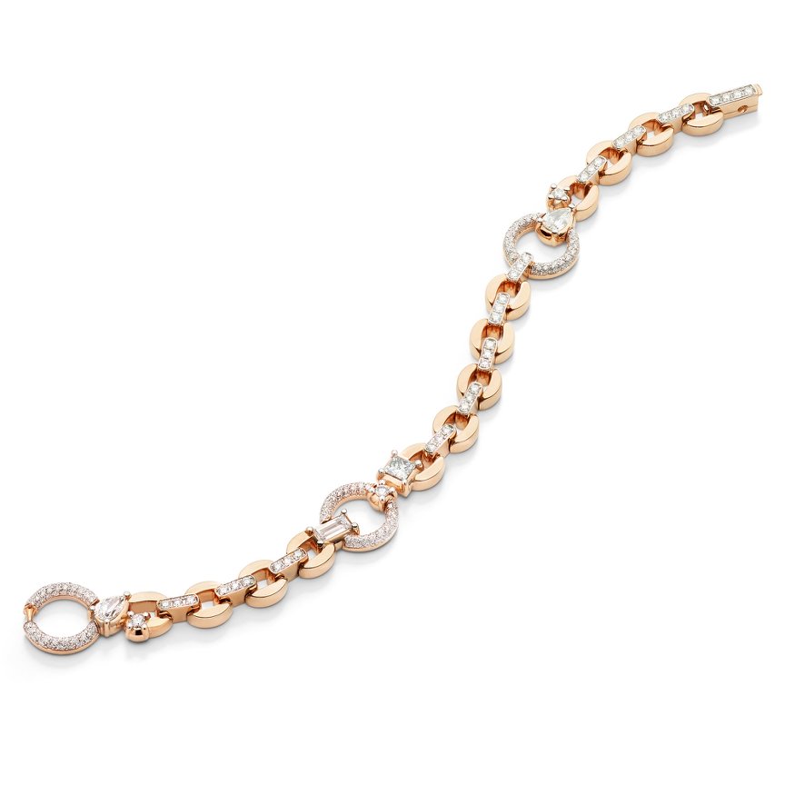 这款玫瑰金手链延续同系列项链的美学风格,镶嵌4颗花式切割钻石与250颗明亮式切割钻石。多个圆环链节相互衔接,勾勒出富有韵律感的轮廓,其间巧妙点缀着三枚密镶钻石的圆环。每枚圆环分别以一颗梨形切割、公主方形切割或长阶梯形切割钻石点睛,在柔和圆润的造型中悄然融入一抹建筑线条般的美学张力。整件作品在醒目造型与精致细节之间实现谐美平衡,同时确保舒适贴合的佩戴体验。