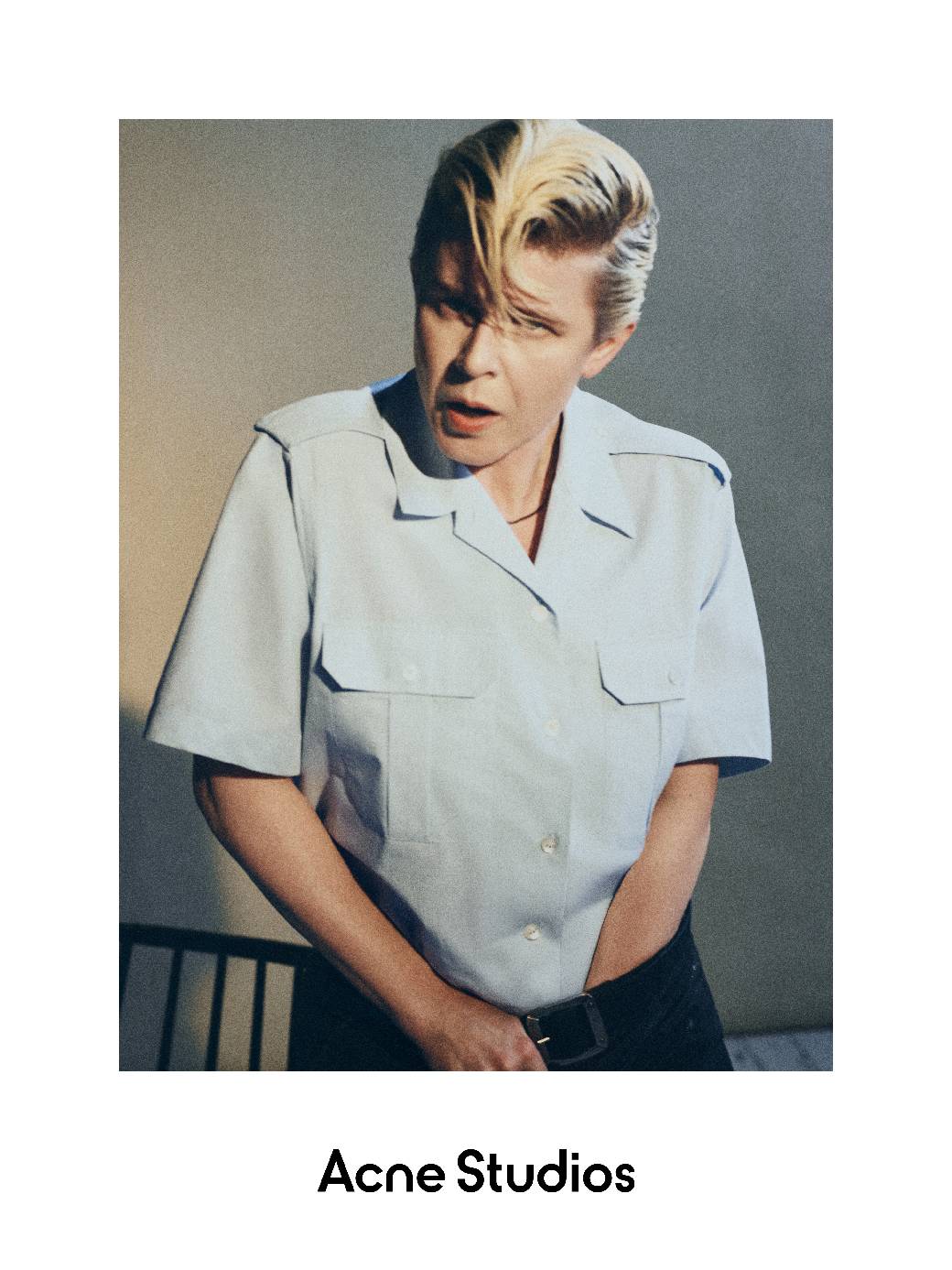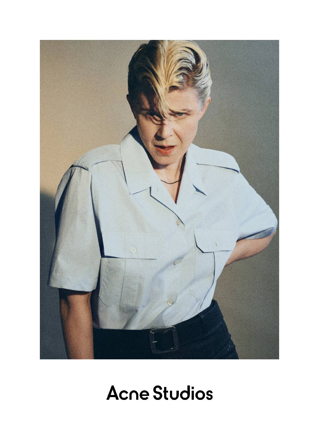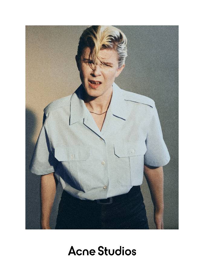 Robyn身着2026春夏系列女装亮相,这个系列融合了男女装的元素,呈现出一种永不被定格的主角形象——身份是流动的,从不被定义。饰有肩章的棉质府绸制服衬衫,成为该系列中的亮点。涂层面料、标志性丹宁以及全新演绎的Camero手袋,搭配皮革流苏或金属搭扣设计,透露出一丝非主流文化的暗流。2026春夏系列的牛仔靴,作为Acne Studios标志性配饰,也贯穿其中。
