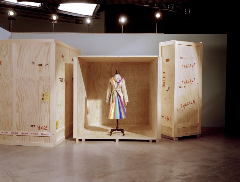 意大利艺术家保拉·皮维以俏皮而富有张力的创作语言著称。她热衷于打破既有语境,通过错位与反差制造视觉悖论。当 Canasta 风衣被寄至她位于夏威夷的住所时,一种强烈的“错位感”油然而生。意大利精裁的防雨风衣,与海岛悠闲氛围之间形成奇妙碰撞。她回忆道,当自己站在车库与卫生间镜前时,窗外葱郁绿意与天窗洒落的空灵光线交织成一道仿佛自肚脐延展的彩虹光谱。由此,“光”成为创作核心。夏威夷几乎每日可见的绚丽彩虹、丰沛植被与自然能量,被转化为风衣正反面垂直排列的多彩条纹,构建出收束于腰部的沙漏廓形。她将这件作品视为一种全新的时尚语汇——融合未来感、时空感与玩趣精神。
