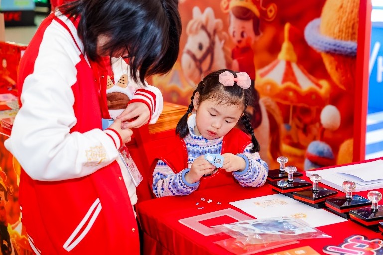 活动现场,恒源祥小囡精心打造的“马织春程 福伴小囡”新春市集,成为亲子家庭的欢乐打卡地。市集长廊红灯笼高挂,祝福牌随风摇曳,小囡新春红包、十二生肖折纸等节庆好物,吸引众多家庭驻足领取。品牌特别设计的“字韵小囡” 与“魁星点斗”两款“吉星福章”纪念印章,更是成为市集亮点:“字韵小囡” 融合中国书法艺术韵律之美,是文化传承的生动缩影;“魁星点斗”寄托着对孩子们智慧与学业的美好期许,鼓励孩子们在新的一年脚踏实地、勇攀高峰。